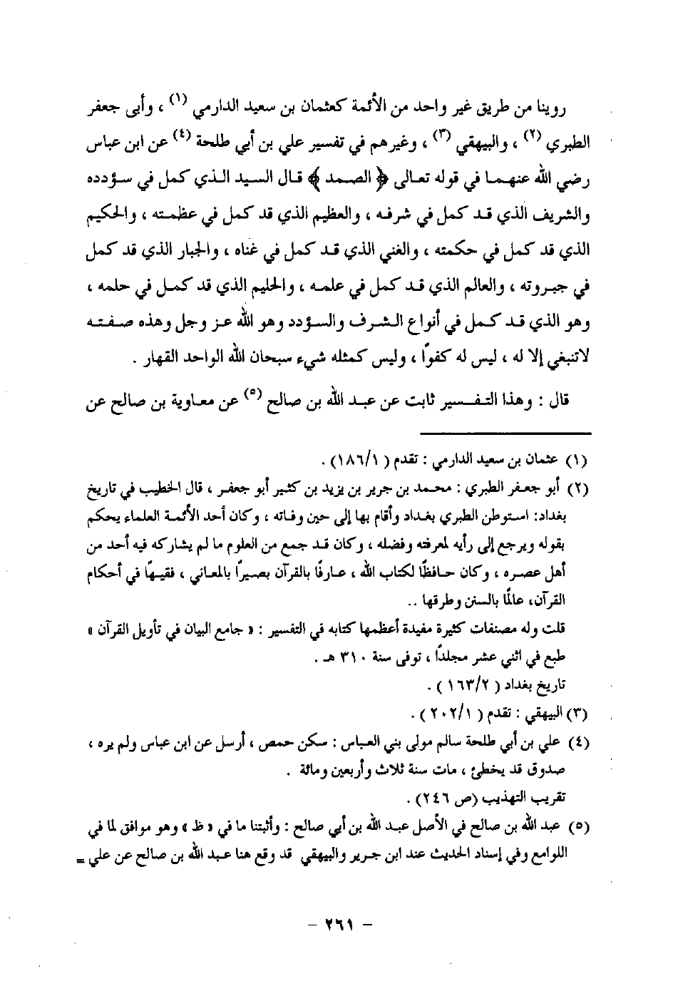 روينا من طريق غير واحد من الأئمة كعثمان بن سعيد الدارمي (¬1)، وأبى جعفر الطبري (¬2)، والبيهقي (¬3)، وغيرهم في تفسير علي بن أبي طلحة (¬4) عن ابن عباس رضي اللَّه عنهما فى قوله تعالى {الصَّمَدُ} قال السيد الذي كمل فى سؤدده والشريف الذي قد كمل في شرفه، والعظيم الذي قد كمل في عظمته، والحكيم الذي قد كمل في حكمته، والغني الذي قد كمل في غناه، والجبار الذي قد كمل في جبروته، والعالم الذي قد كمل في علمه، والحليم الذي قد كمل في حلمه، وهو الذي قد كمل في أنواع الشرف والسؤدد وهو اللَّه عز وجل وهذه صفته لا تنبغي إلا له، ليس له كفوًا، وليس كمثله شيء سبحان اللَّه الواحد القهار.