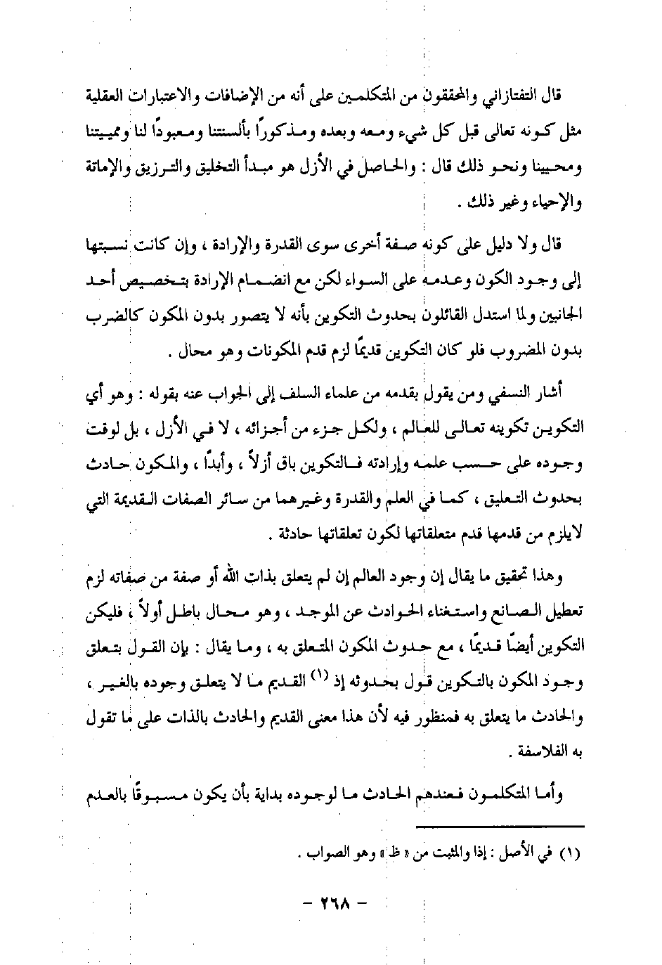 قال ولا دليل على كونه صفة أخرى سوى القدرة والإرادة، وإن كانت نسبتها إلى وجود الكون وعدمه على السواء لكن مع انضمام الإرادة بتخصيص أحد الجانبين ولما استدل القائلون بحدوث التكوين بأنه لا يتصور بدون المكون كالضرب بدون المضروب فلو كان التكوين قديمًا لزم قدم المكونات وهو محال.