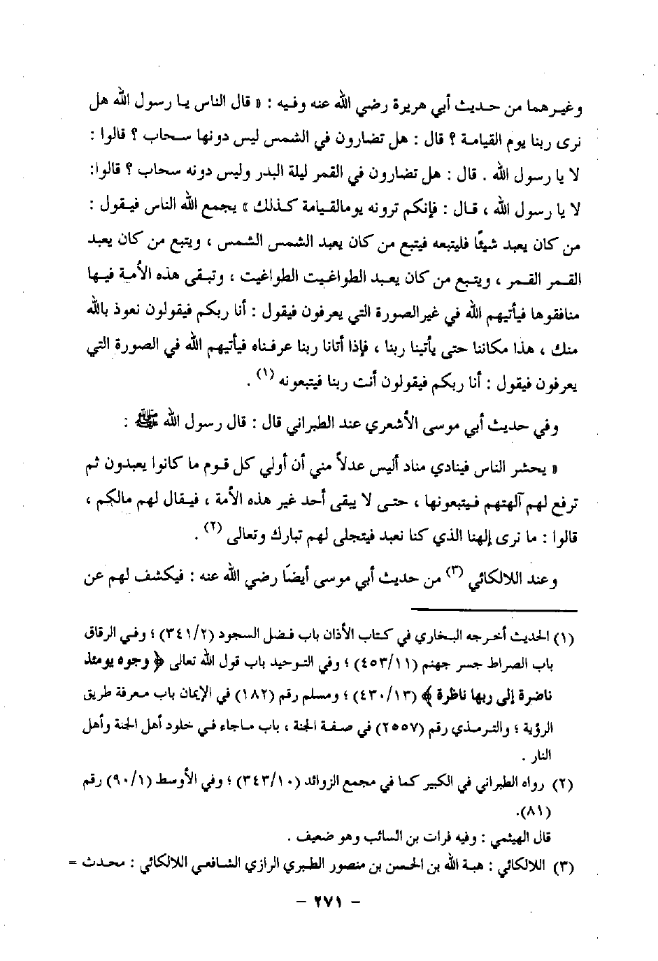 وغيرهما من حديث أبي هريرة رضي اللَّه عنه وفيه: "قال الناس يا رسول اللَّه هل نرى ربنا يوم القيامة؟ قال: هل تضارون في الشمس ليس دونها سحاب؟ قالوا: لا يا رسول اللَّه. قال: هل تضارون في القمر ليلة البدر وليس دونه سحاب؟ قالوا: لا يا رسول اللَّه، قال: فإنكم ترونه يوم القيامة كذلك" يجمع اللَّه الناس فيقول: من كان يعبد شيئًا فليتبعه فيتبع من كان يعبد الشمس الشمس، ويتبع من كان يعبد القمر القمر، ويتبع من كان يعبد الطواغبت الطواغيت، وتبقى هذه الأمة فيها منافقوها فيأتيهم اللَّه في غير الصورة التي يعرفون فيقول: أنا ربكم فيقولون نعوذ باللَّه منك، هذا مكاننا حتى يأتينا ربنا، فإذا أتانا ربنا عرفناه فيأتيهم اللَّه في الصورة التي يعرفون فيقول: أنا ربكم فيقولون أنت ربنا فيتبعونه (¬1).