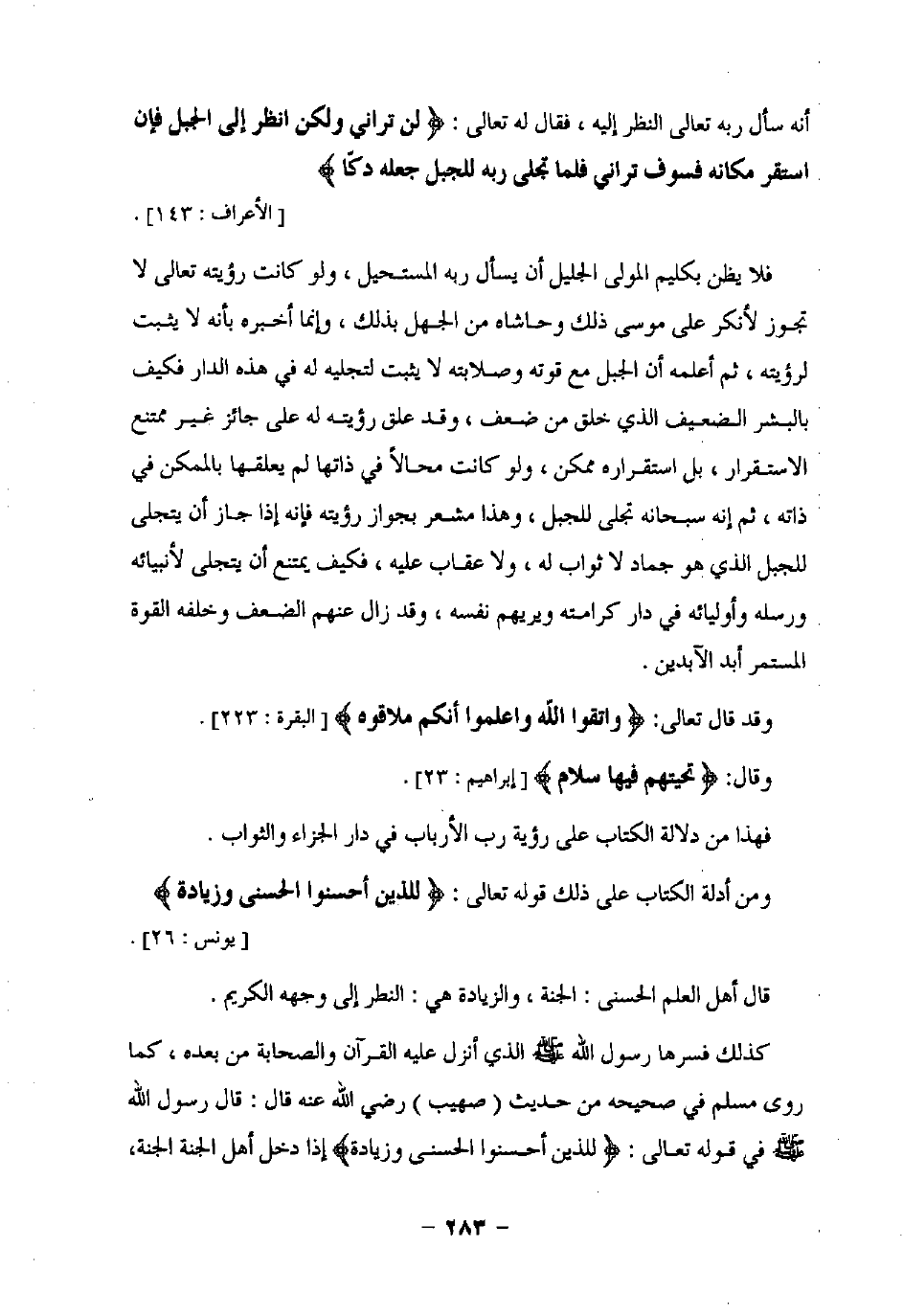 كذلك فسرها رسول اللَّه -صلى اللَّه عليه وسلم- الذي أنزل عليه القرآن والصحابة من بعده، كما روى مسلم في صحيحه من حديث (صهيب) رضي اللَّه عنه قال: قال رسول اللَّه -صلى اللَّه عليه وسلم- في قوله تعالى: {لِلَّذِينَ أَحْسَنُوا الْحُسْنَى وَزِيَادَةٌ} إذا دخل أهل الجنة الجنة،