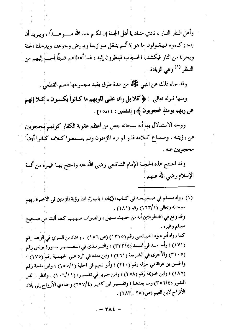ووجه الاستدلال بها أنه سبحانه جعل من أعظم عقوبة الكفار كونهم محجوبين عن رؤيته، وسماع كلامه فلو لم يره المؤمنون ولم يسمعوا كلامه كانوا أيضًا محجوبين عنه.