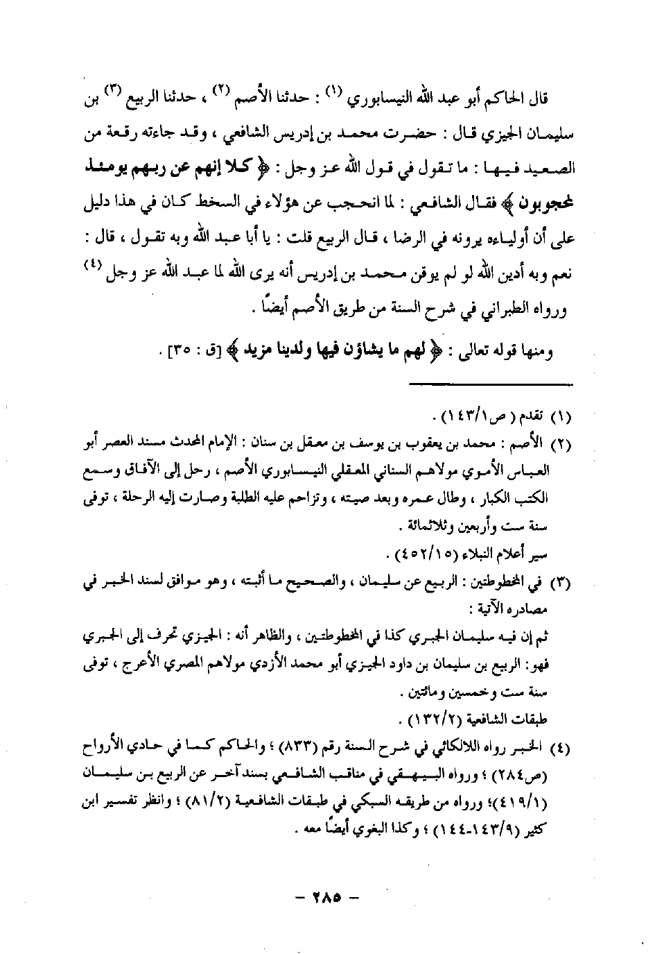 (¬4) الحبر رواه اللالكائي في شرح السنة رقم (833)، والحاكم كما في حادي الأرواح (ص 284)؛ ورواه البيهقي في مناقب الشافعي بسند آخر عن الربيع بن سليمان (1/ 419)؛ ورواه من طريقه السبكي في طبقات الشافعية (2/ 81)؛ وانظر تفسير ابن كثير (9/ 143 - 144)، وكذا البغوي أيضًا معه.