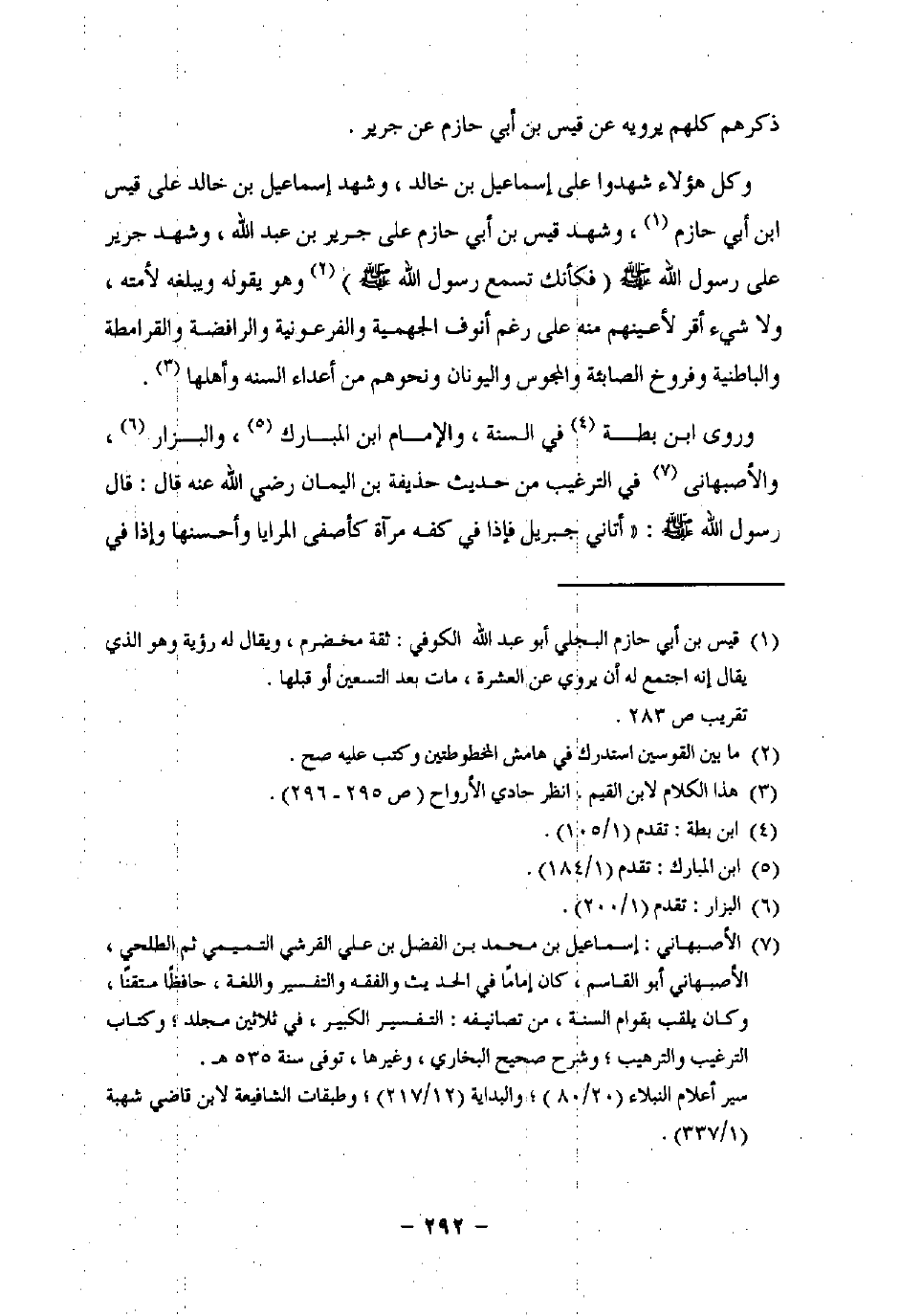 وكل هؤلاء شهدوا على إسماعيل بن خالد، وشهد إسماعيل بن خالد على قيس ابن أبي حازم (¬1)، وشهد قيس بن أبي حازم على جرير بن عبد اللَّه، وشهد جرير على رسول اللَّه -صلى اللَّه عليه وسلم- (فكأنك تسمع رسول اللَّه -صلى اللَّه عليه وسلم-) (¬2) وهو يقوله ويبلغه لأمته، ولا شيء أقر لأعينهم منه على رغم أنوف الجهمية والفرعرنية والرافضة والقرامطة والباطنية وفروخ الصابئة والمجوس واليونان ونحوهم من أعداء السنة وأهلها (¬3).
