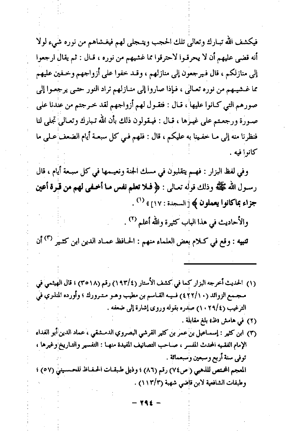 وفي لفظ البزار: فهم يتقلبون في مسك الجنة ونعيمها في كل سبعة أيام، قال رسول اللَّه -صلى اللَّه عليه وسلم- وذلك قوله تعالى: {فَلَا تَعْلَمُ نَفْسٌ مَا أُخْفِيَ لَهُمْ مِنْ قُرَّةِ أَعْيُنٍ جَزَاءً بِمَا كَانُوا يَعْمَلُونَ} [السجدة: 17] " (¬1).