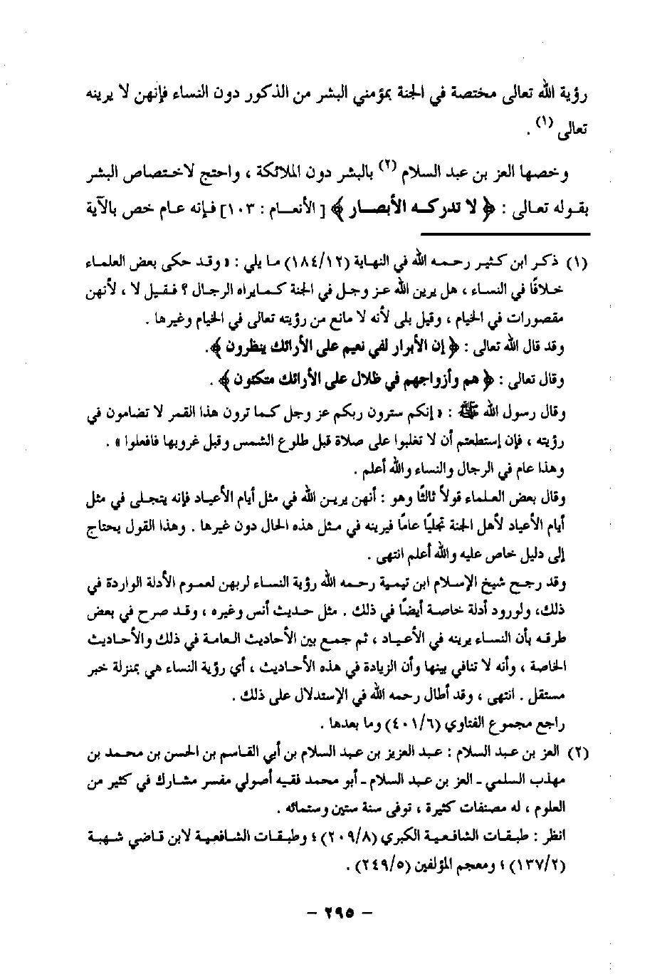 (¬1) ذكر ابن كثير رحمه اللَّه في النهاية (12/ 184) ما يلي: "وقد حكى بعض العلماء خلافًا في النساء، هل يرين اللَّه عز وجل في الجنة كما يراه الرجال؟ فقل لا، لأنهن مقصورات في الخيام، وقيل بلى لأنه لا مانع من رؤيته تعالى في الخيام وغيرها.