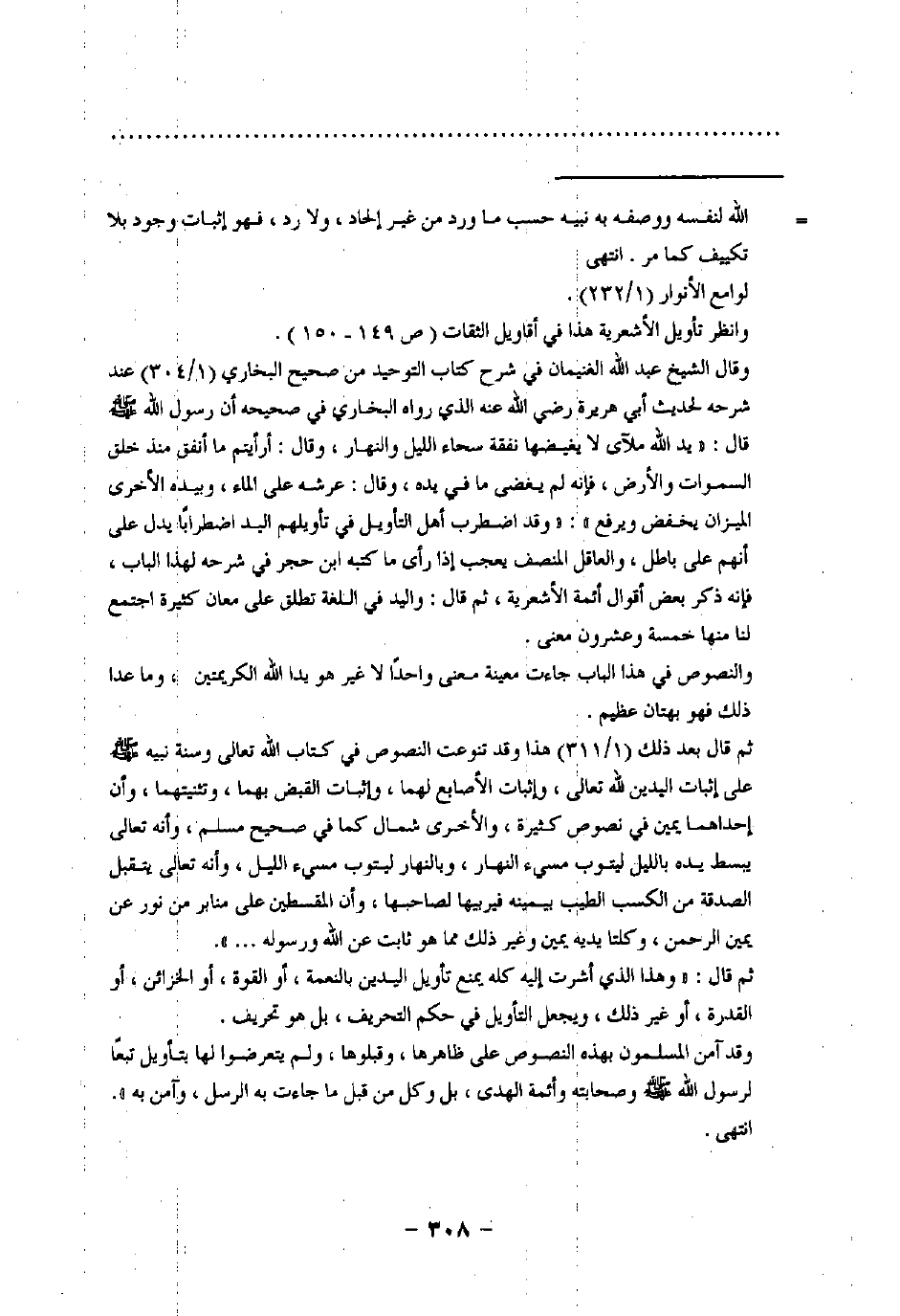 ثم قال بعد ذلك (1/ 311) هذا وقد تنوعت النصوص في كتاب اللَّه تعالى وسنة نبيه -صلى اللَّه عليه وسلم- على إثبات اليدين للَّه تعالى، وإثبات الأصابع لهما، وإثبات القبض بهما، وتثنيتهما، وأن إحداها يمين في نصوص كثيرة، والأخرى شمال كما في صحيح مسلم، وأنه تعالى يبسط يده بالليل ليتوب مسيء النهار، وبالنهار ليتوب مسيء الليل، وأنه تعالى يتقبل الصدقة من الكسب الطيب بيمينه فيربيها لصاحبها، وأن المقسطين على منابر من نور عن يمين الرحمن، وكلتا يديه يمين وغير ذلك مما هو ثابت عن اللَّه ورسوله. . .".