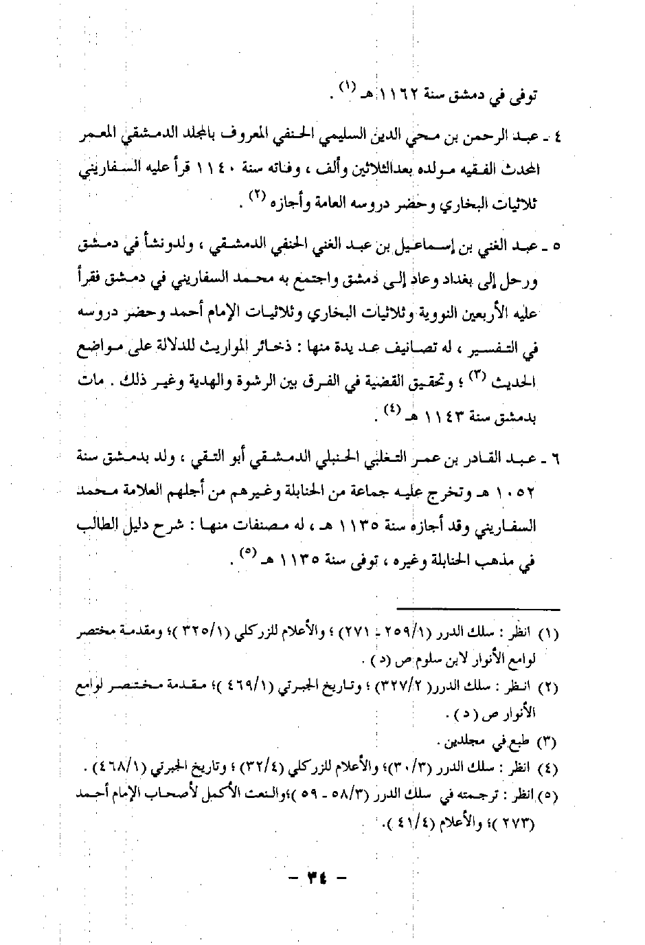 4 - عبد الرحمن بن محي الدين السليمي الحنفي المعروف بالمجلد الدمشقي المعمر المحدث الفقيه مولده بعد الثلاثين وألف، وفاته سنة 1140 قرأ عليه السفاريني ثلاثيات البخاري وحضر دروسه العامة وأجازه (¬2).