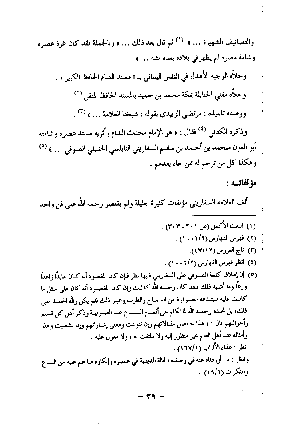 (¬5) إن إطلاق كلمة الصوفي على السفاريني فيها نظر فإن كان المقصود أنه كان عابدًا زاهدًا ورعًا وما أشبه ذلك فقد كان رحمه اللَّه كذلك وإن كان المقصود أنه كان على مثل ما كانت عليه مبتدعة الصوفية من السماع والطرب وغير ذلك فلم يكن وللَّه الحمد على ذلك، بل نجده رحمه اللَّه لما تكلم عن أقسام السماع عند الصوفية وذكر أهل كل قسم وأحوالهم قال: "هذا حاصل مقالاتهم وإن تنوعت ومعنى إشاراتهم وإن تشعبت وهذا وأمثاله عند أهل العلم غير منظور إليه ولا ملتفت له، ولا معول عليه.