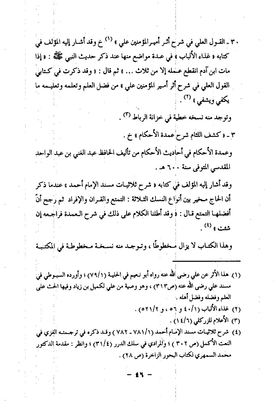 30 - "القول العلي في شرح أثر أمير المؤمنين علي" (¬1) خ وقد أشار إليه المؤلف في كتابه "غذاء الألباب" في عدة مواضع منها عند ذكر حديث النبي -صلى اللَّه عليه وسلم-: "إذا مات ابن آدم انقطع عمله إلا من ثلاث. . . " ثم قال: "وقد ذكرت في كتابي القول العلي في شرح أثر أمير المؤمنين علي" من فضل العلم وتعلمه وتعليمه ما يكفي ويشفي" (¬2).