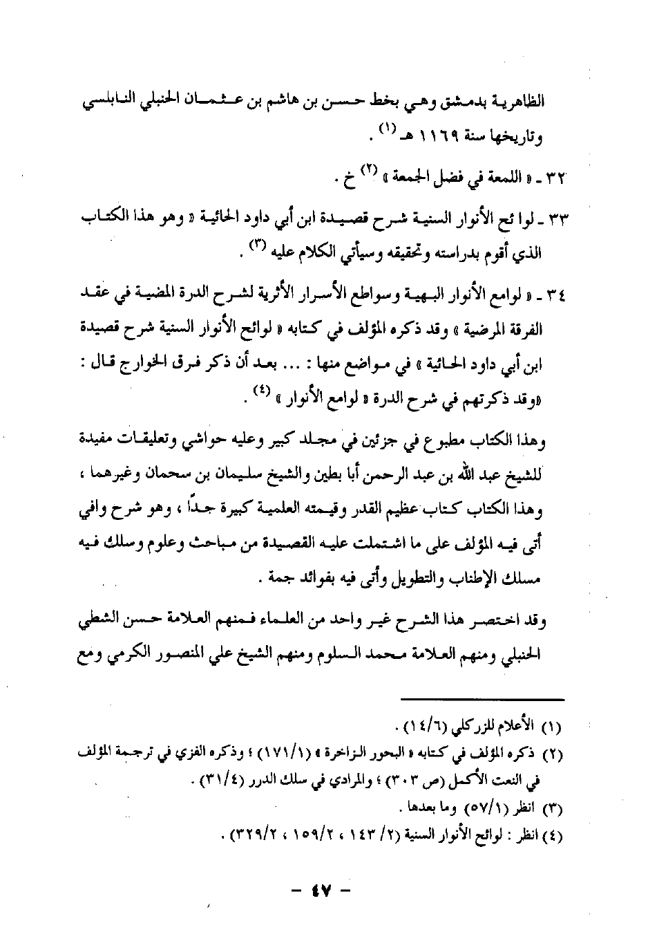 34 - "لوامع الأنوار البهية وسواطع الأسرار الأثرية لشرح الدرة المضية في عقد الفرقة المرضية" وقد ذكره المؤلف في كتابه "لوائح الأنوار السنية شرح قصيدة ابن أبي داود الحائية" فى مواضع منها:. . . بعد أن ذكر فرق الخوارج قال: "وقد ذكرتهم في شرح الدرة "لوامع الأنوار" (¬4).