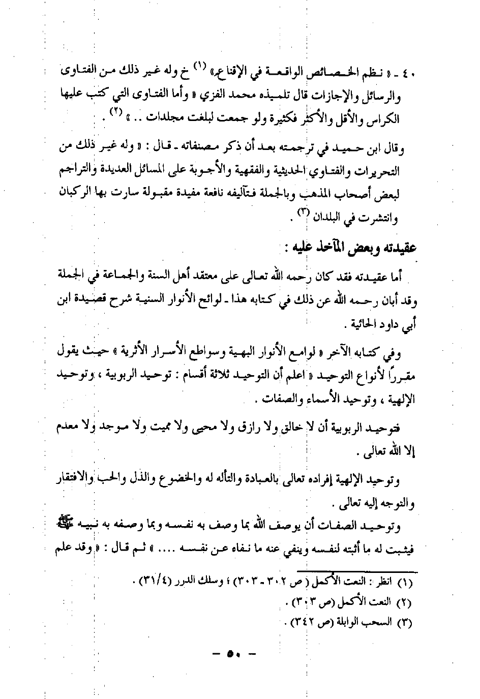 وقال ابن حميد في ترجمته بعد أن ذكر مصنفاته -قال: "وله غير ذلك من التحريرات والفتاوي الحديثية والفقهية والأجوبة على المسائل العديدة والتراجم لبعض أصحاب المذهب وبالجملة فتآليفه نافعة مفيدة مقبولة سارت بها الركبان وانتشرت في البلدان (¬3).