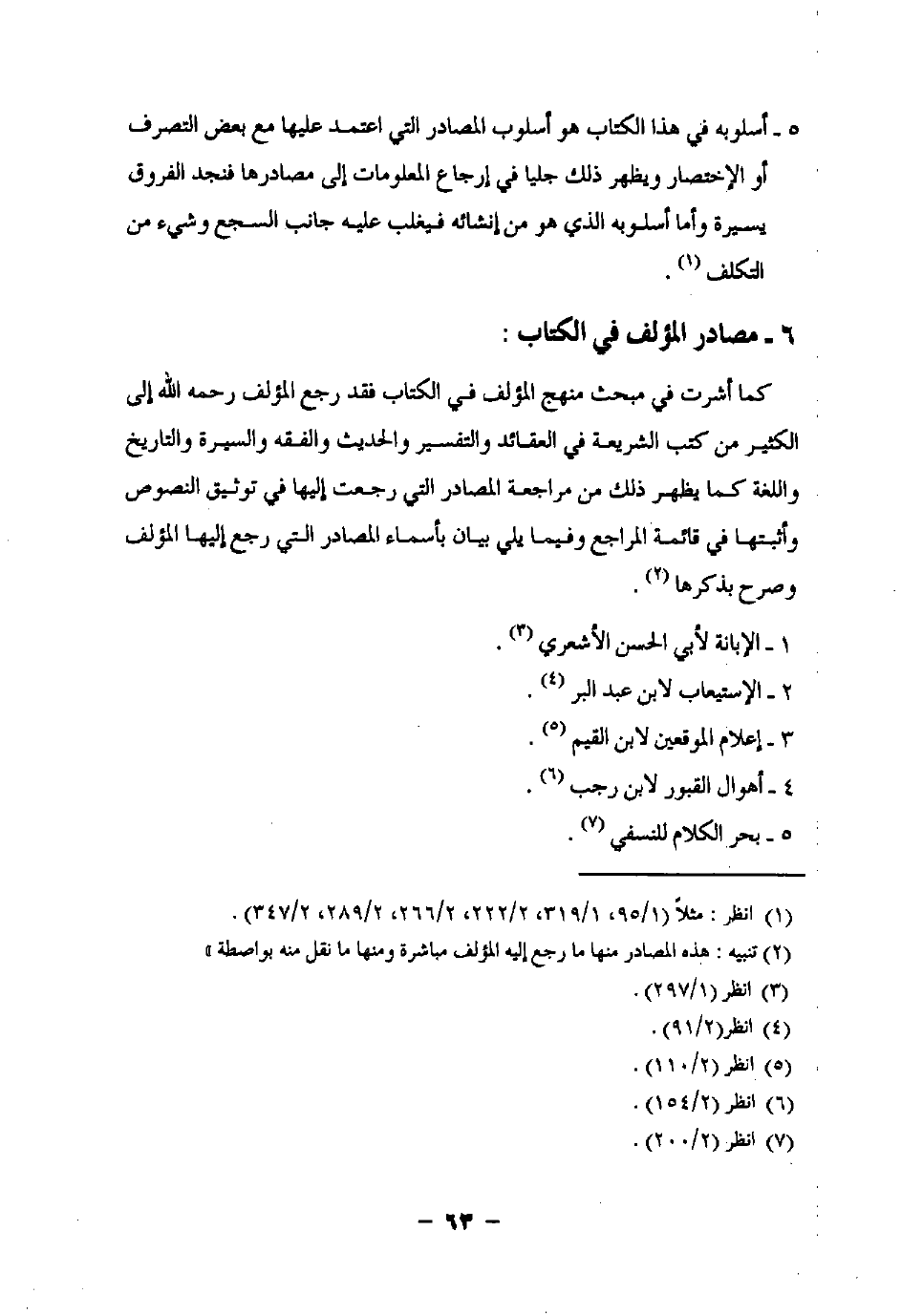 كما أشرت في مبحث منهج المؤلف في الكتاب فقد رجع المؤلف رحمه اللَّه إلى الكثير من كتب الشريعة في العقائد والتفسير والحديث والفقه والسيرة والتاريخ واللغة كما يظهر ذلك من مراجعة المصادر التي رجعت إليها في توثيق النصوص وأثبتها في قائمة المراجع وفيما يلي بيان بأسماء المصادر التي رجع إليها المؤلف وصرح بذكرها (¬2).