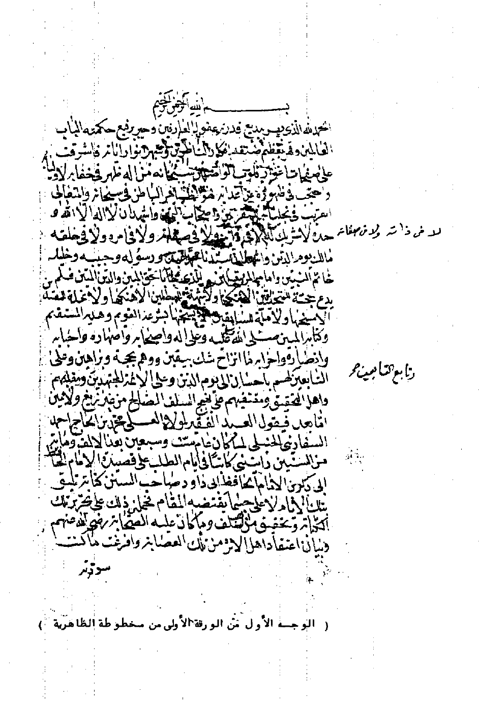 (الوجه الأول من الورقة الأولى من مخطوطة الظاهرية)