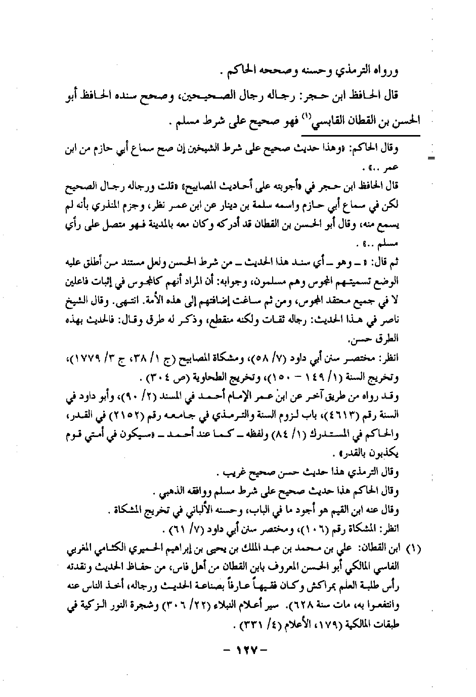 (¬1) ابن القطان: علي بن محمد بن عبد الملك بن يحيى بن إبراهيم الحميرى الكثامي المغربي الفاسي المالكي أبو الحسن المعروف بابن القطان من أهل فاس، من حفاظ الحديث ونقدته رأس طلبة العلم بمراكش وكان فقيهًا عارفًا بصناعة الحديث ورجاله، أخذ الناس عنه وانتفعوا به، مات سنة 628). سير أعلام النبلاء (22/ 306) وشجرة النور الزكية في طبقات المالكية (179) الأعلام (4/ 331).