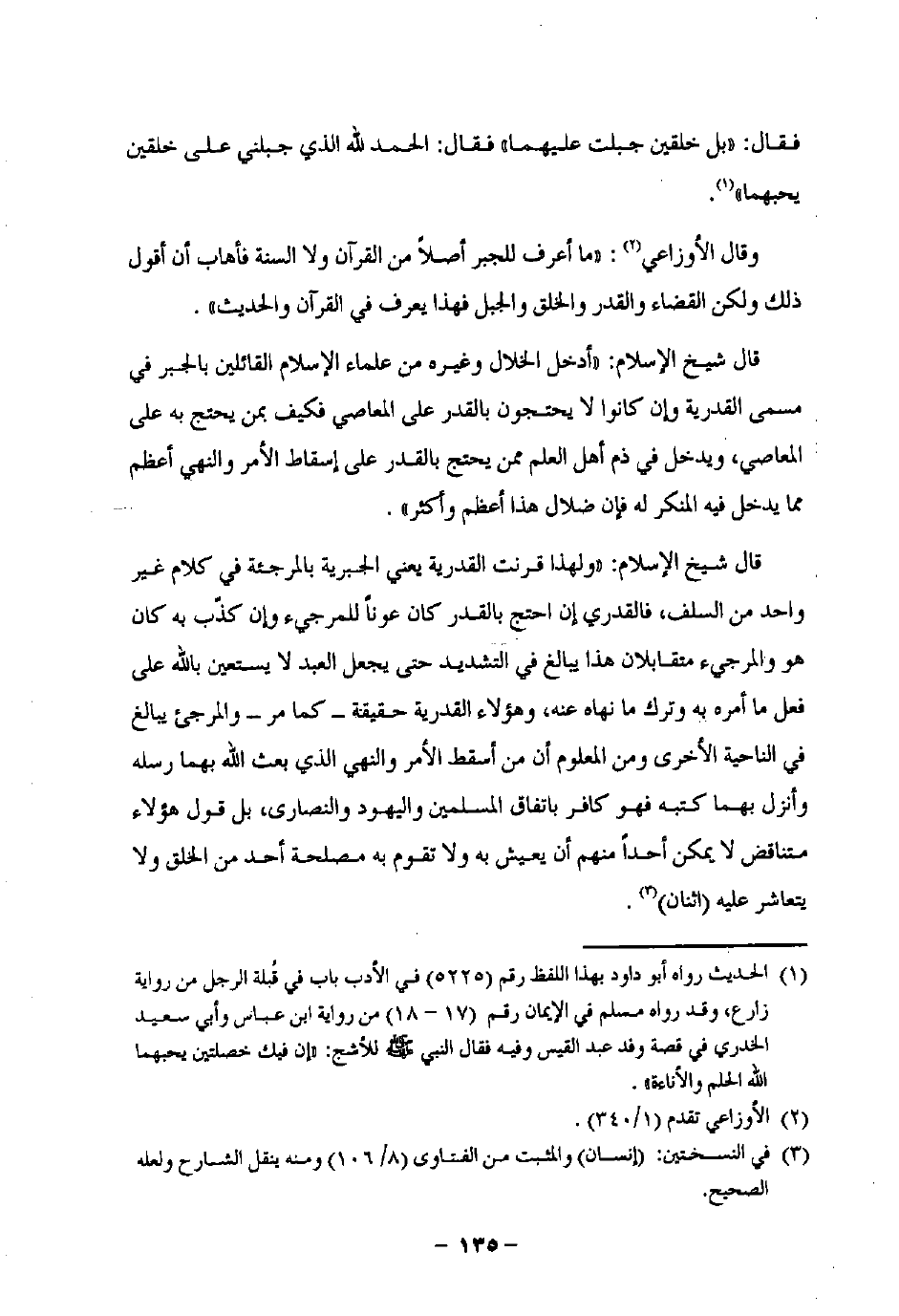 وقال الأوزاعي (¬2): "ما أعرف للجبر أصلًا من القرآن ولا السنة فأهاب أن أقول ذلك ولكن القضاء والقدر والخلق والجبل فهذا يعرف في القرآن والحديث".