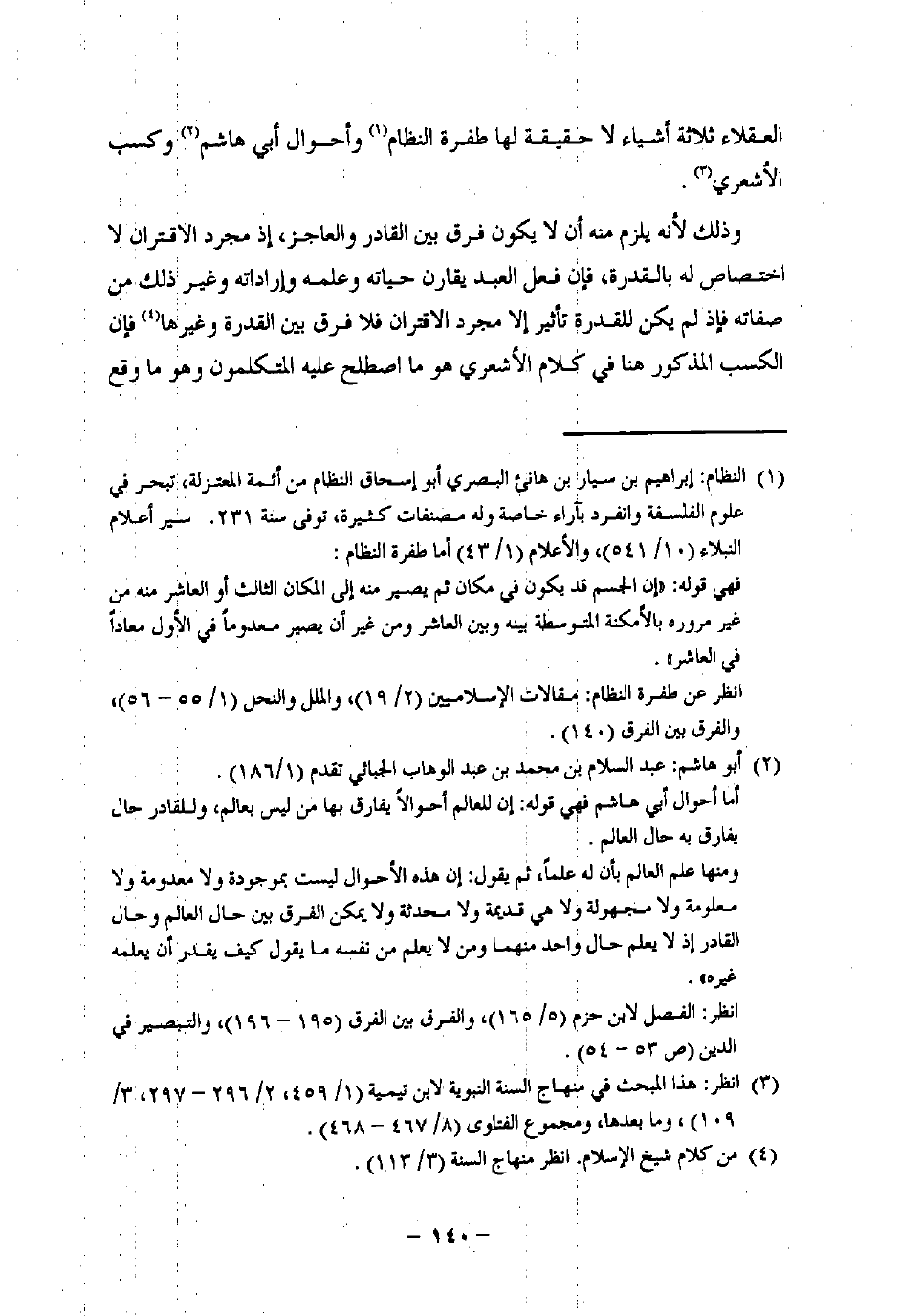 (¬1) النظام: إبراهيم بن سيار بن هانئ البصري أبو اسحاق النظام من أئمة المعتزلة، تبحر في علوم الفلسفة وانفرد بآراء خاصة وله مصنفات كثبرة، توفى سنة 231. سير أعلام النبلاء (10/ 541)؛ والأعلام (1/ 43) أما طفرة النظام: