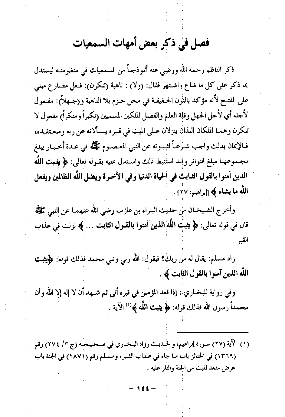 ذكر الناظم رحمه اللَّه ورضي عنه أنموذجًا من السمعيات في منظومته ليستدل بما ذكر على كل ما شاع واشتهر فقال: (ولا): ناهية (تنكرن): فعل مضارع مبني على الفتح لأنه مؤكد بالنون الخفيفة في محل جزم بلا الناهية و (جهلًا): مفعول لأجله أي لأجل الجهل وقلة الحلم والفضل الملكين المسميين (نكيرًا ومنكرًا) مفعول لا تنكرن وهما الملكان اللذان ينزلان على الميت في قبره يسألانه عن ربه ومعتقده، فالإيمان بذلك واجب شرعًا لثبوته عن النبي المعصوم -صلى اللَّه عليه وسلم- في عدة أخبار يبلغ مجموعها مبلغ التواتر وقد استنبط ذلك واستدل عليه بقوله تعالى: {يُثَبِّتُ اللَّهُ الَّذِينَ آمَنُوا بِالْقَوْلِ الثَّابِتِ فِي الْحَيَاةِ الدُّنْيَا وَفِي الْآخِرَةِ وَيُضِلُّ اللَّهُ الظَّالِمِينَ وَيَفْعَلُ اللَّهُ مَا يَشَاءُ} [إبراهيم: 27].