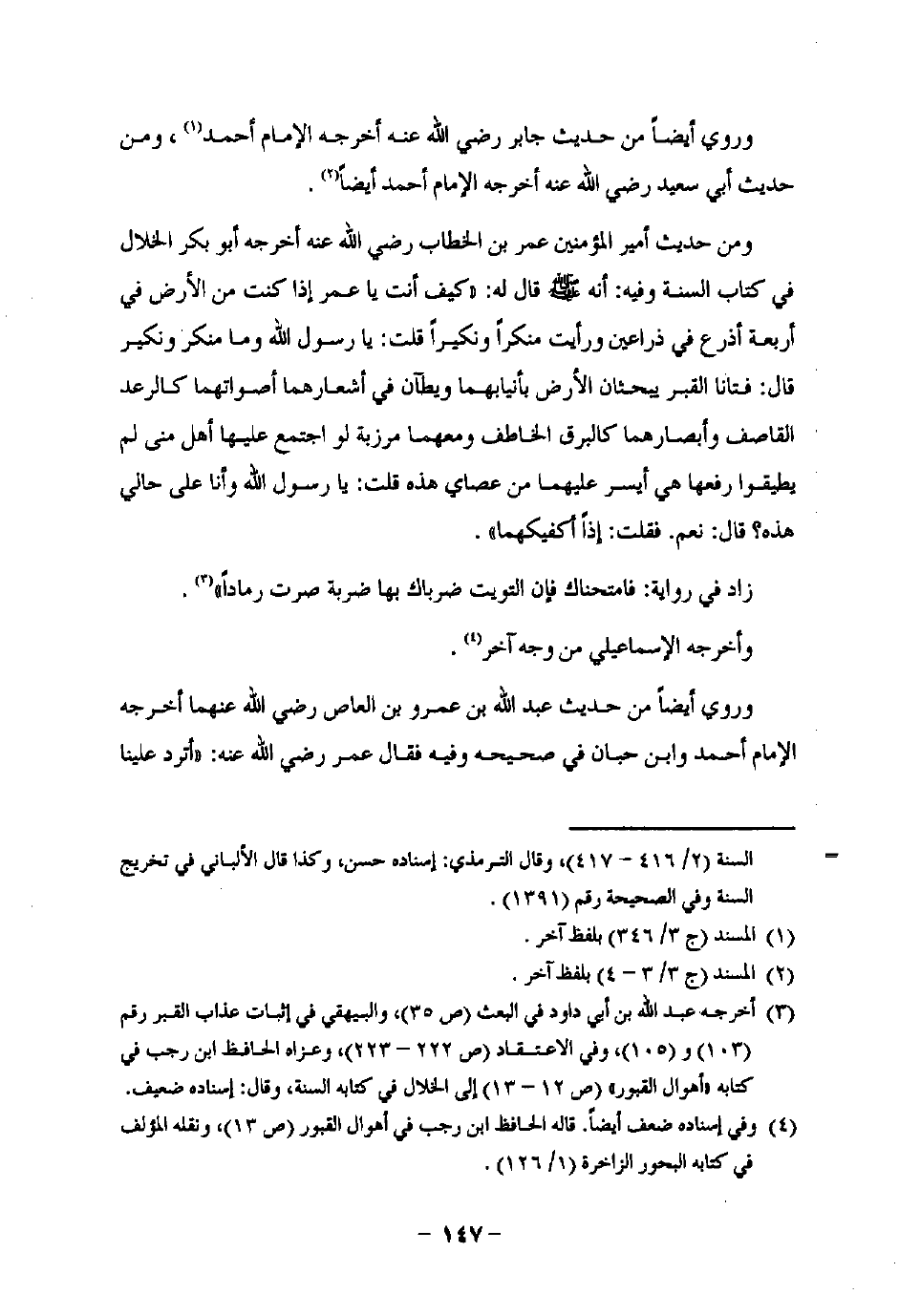 ومن حديث أمير المؤمنين عمر بن الخطاب رضي اللَّه عنه أخرجه أبو بكر الخلال في كتاب السنة وفيه: أنه -صلى اللَّه عليه وسلم- قال له: "كيف أنت يا عمر إذا كنت من الأرض في أربعة أذرع في ذراعين ورأيت منكرًا ونكيرًا قلت: يا رسول اللَّه وما منكر ونكير قال: فتانا القبر يبحثان الأرض يأنيابهما ويطآن في أشعارهما أصواتهما كالرعد القاصف وأبصارهما كالبرق الخاطف ومعهما مرزبة لو اجتمع عليها أهل منى لم يطيقوا رفعها هي أيسر عليهما من عصاي هذه قلت: يا رسول اللَّه وأنا على حالي هذه؟ قال: نعم. فقلت: إذًا أكفيكهما".