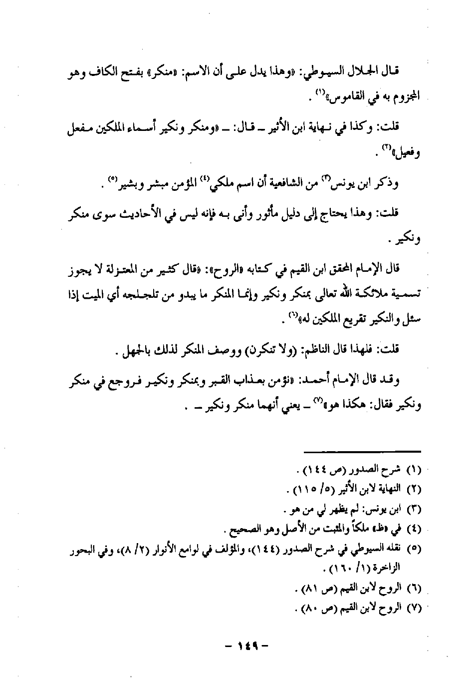 قال الإمام المحقق ابن القيم في كتابه "الروح": "قال كثير من المعتزلة لا يجوز تسمية ملائكة اللَّه تعالى بمنكر ونكير وإنما المنكر ما يبدو من تلجلجه أي الميت إذا سئل والنكير تقريع الملكين له" (¬6).