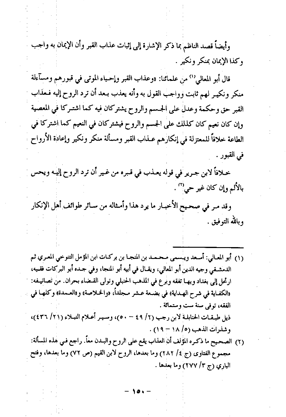 (¬2) الصحيح ما ذكره المؤلف أن العذاب يقع على الروح والبدن معًا. راجع في هذه المسألة: مجموع الفتاوى (ج 4/ 282) وما بعدها، الروح لابن القيم (ص 72) وما بعدها، فتح الباري (ج 3/ 277) وما بعدها.