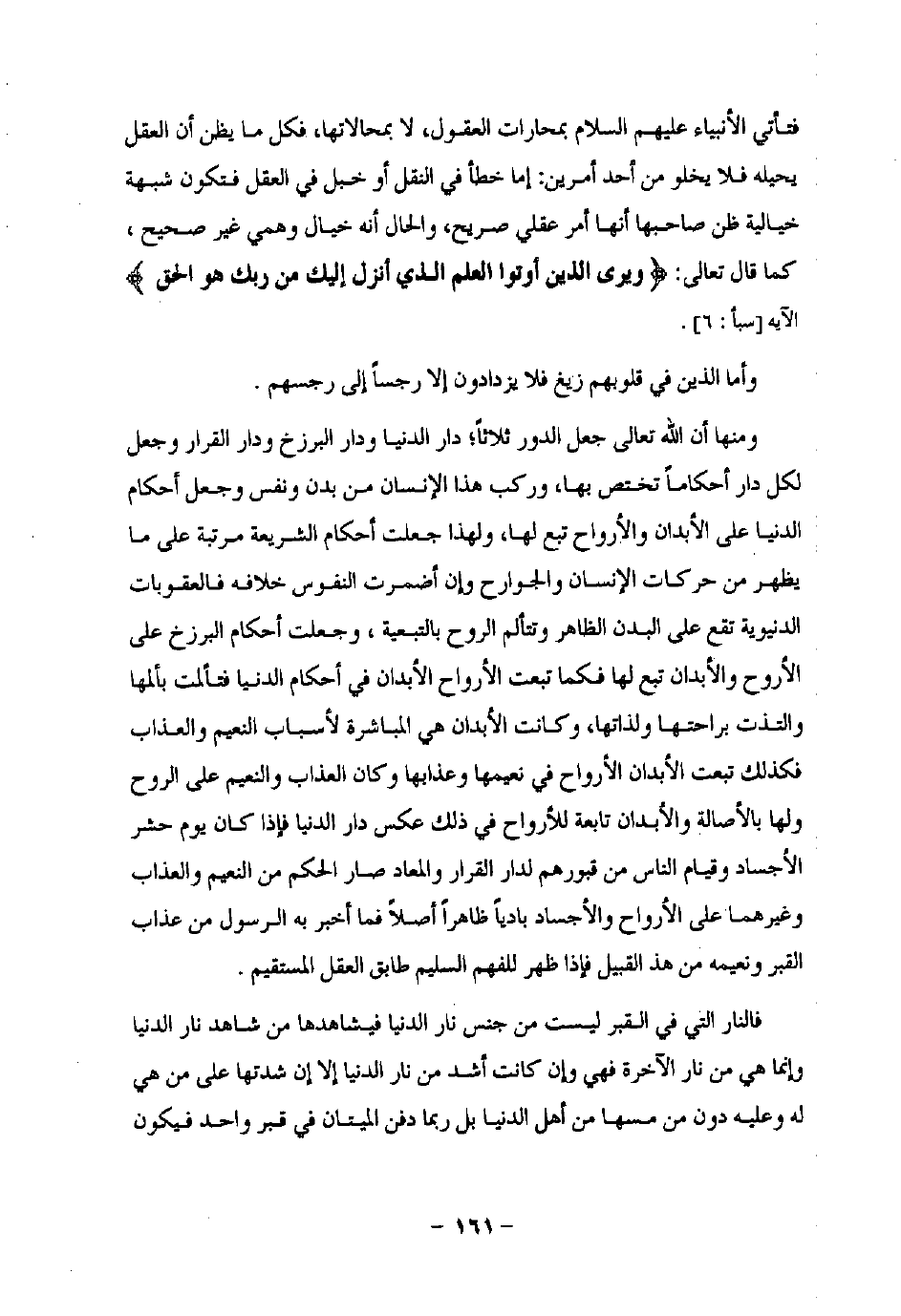 فتأتي الأنبياء عليهم السلام بمحارات العقول، لا بمحالاتها، فكل ما يظن أن العقل يحيله فلا خلو من أحد أمرين: إما خطأ في النقل أو خبل في العقل فتكون شبهة خيالية ظن صاحبها أنها أمر عقلي صريح، والحال أنه خيال وهمي غير صحيح، كما قال تعالى: {وَيَرَى الَّذِينَ أُوتُوا الْعِلْمَ الَّذِي أُنْزِلَ إِلَيْكَ مِنْ رَبِّكَ هُوَ الْحَقَّ} الآية [سبأ: 6].