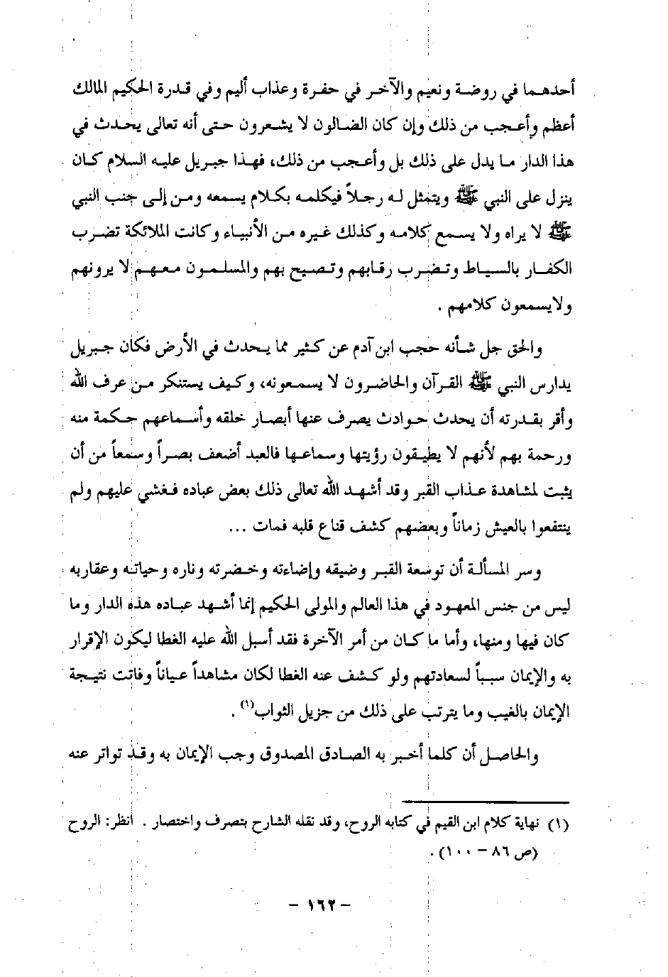 أحدهما في روضة ونعيم والآخر في حفرة وعذاب أليم وفي قدرة الحكيم المالك أعظم وأعجب من ذلك وإن كان الضالون لا يشعرون حتى أنه تعالى يحدث في هذا الدار ما يدل على ذلك بل وأعجب من ذلك، فهذا جبريل عليه السلام كان ينزل على النبي -صلى اللَّه عليه وسلم- ويتمثل له رجلًا فيكلمه بكلام يسمعه ومن إلى جنب النبي -صلى اللَّه عليه وسلم- لا يراه ولا يسمع كلامه وكذلك غيره من الأنبياء وكانت الملائكة تضرب الكفار بالسياط وتضرب رقابهم وتصيح بهم والمسلمون معهم لا يرونهم ولا يسمعون كلامهم.