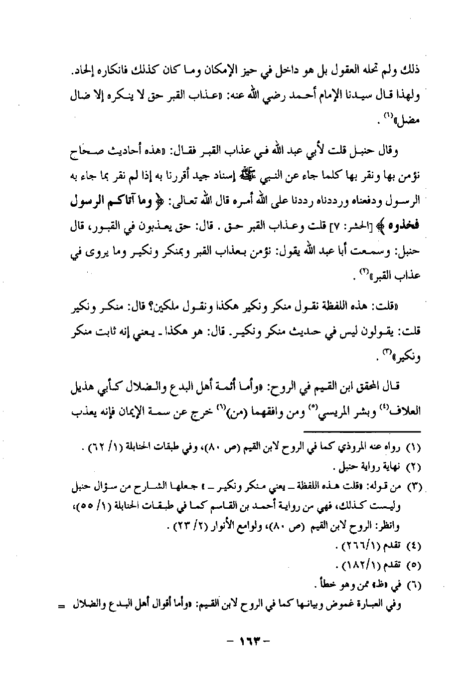 وقال حنبل قلت لأبي عبد اللَّه في عذاب القبر فقال: "هذه أحاديث صحاح نؤمن بها ونقر بها كلما جاء عن النبي -صلى اللَّه عليه وسلم- إسناد جيد أقررنا به إذا لم نقر بما جاء به الرسول ودفعناه ورددناه رددنا على اللَّه أمره قال اللَّه تعالى: {وَمَا آتَاكُمُ الرَّسُولُ فَخُذُوهُ} [الحشر: 7] قلت وعذاب القبر حق. قال: حق يعذبون في القبور، قال حنبل: وسمعت أبا عبد اللَّه يقول: نؤمن بعذاب القبر وبمنكر ونكير وما يروى في عذاب القبر" (¬2).
