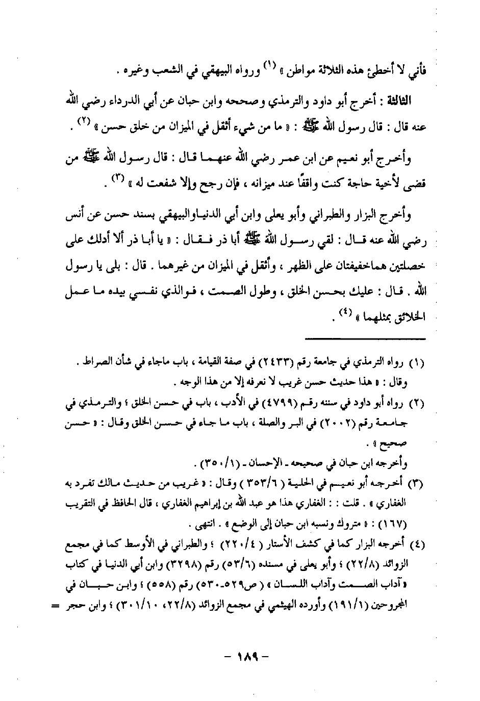 الثالثة: أخرج أبو داود والترمذي وصححه وابن حبان عن أبي الدرداء رضي اللَّه عنه قال: قال رسول اللَّه -صلى اللَّه عليه وسلم-: "ما من شيء أثقل في الميزان من خلق حسن" (¬2).