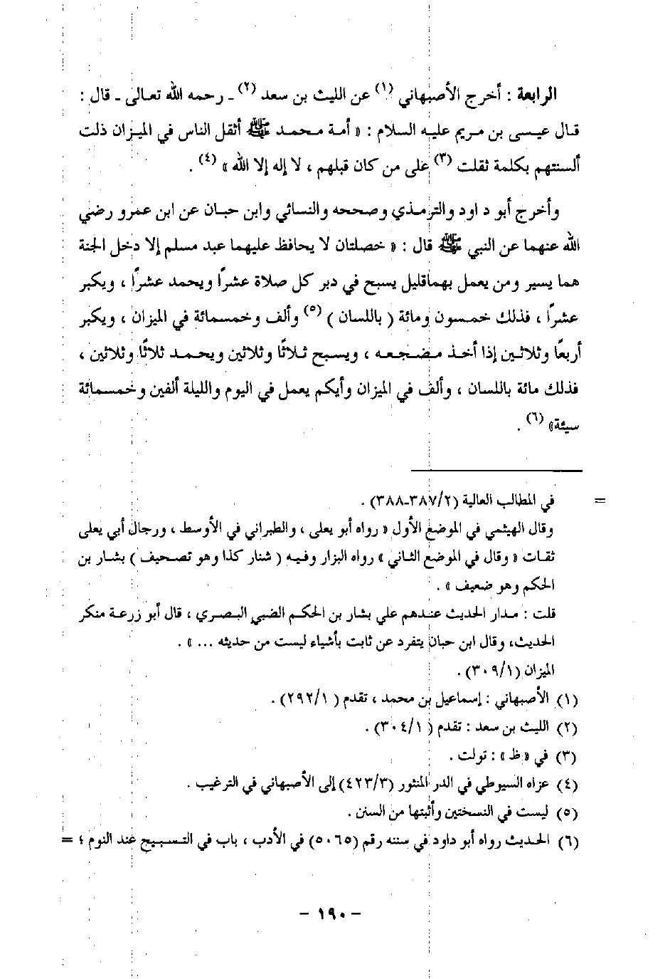 الرابعة: أخرج الأصبهاني (¬1) عن الليث بن سعد (¬2) -رحمه اللَّه تعالى- قال: قال عيسى بن مريم عليه السلام: "أمة محمد -صلى اللَّه عليه وسلم- أثقل الناس في الميزان ذلت ألسنتهم بكلمة ثقلت (¬3) على من كان قبلهم، لا إله إلا اللَّه" (¬4).