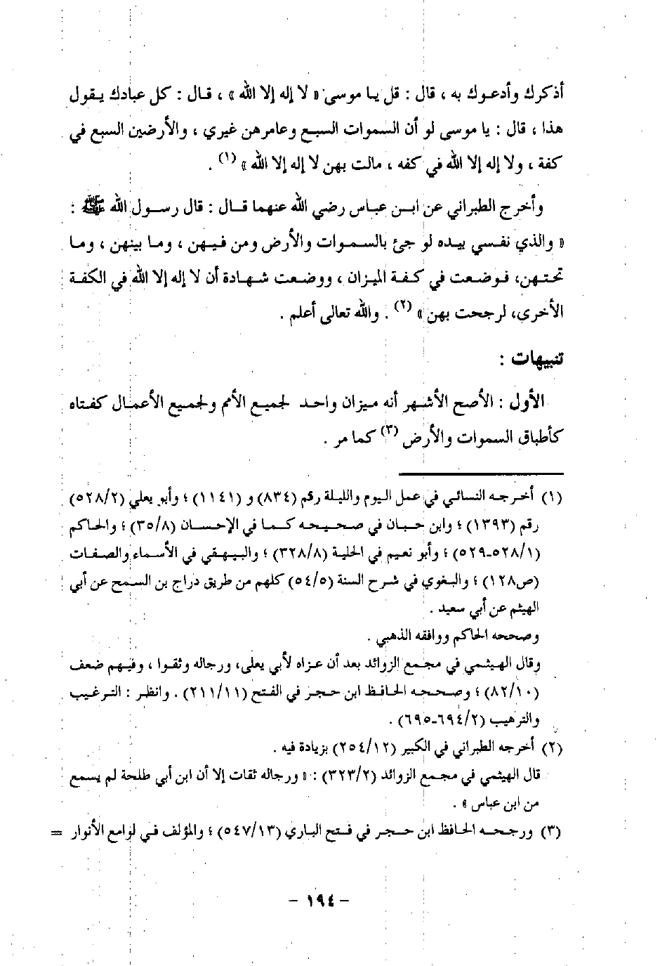 وأخرج الطبراني عن ابن عباس رضي اللَّه عنهما قال: قال رسول اللَّه -صلى اللَّه عليه وسلم-: "والذي نفسي بيده لو جئ بالسموات والأرض ومن فيهن، وما بينهن، وما تحتهن، فوضعت في كفة الميزان، ووضعت شهادة أن لا إله الا اللَّه في الكفة الأخرى، لرجحت بهن" (¬2). واللَّه تعالى أعلم.