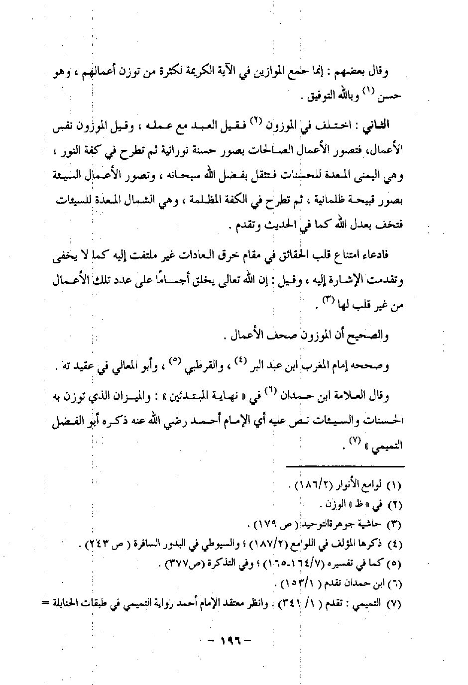 وقال العلامة ابن حمدان (¬6) في "نهاية المبتدئين": والميزان الذي توزن به الحسنات والسيئات نص عليه أي الإمام أحمد رضي اللَّه عنه ذكره أبو الفضل التميمي" (¬7).