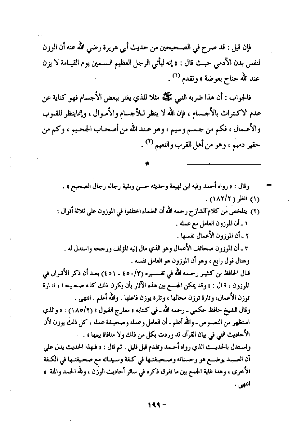 وقال الشيخ حافظ حكمي -رحمه اللَّه- في كتابه "معارج القبول" (2/ 185): "والذي استظهر من النصوص -واللَّه أعلم- أن العامل وعمله وصحيفة عمله، كل ذلك موزن لأن الأحاديث التي في بيان القرآن قد وردت بكل من ذلك ولا منافاة يينها".