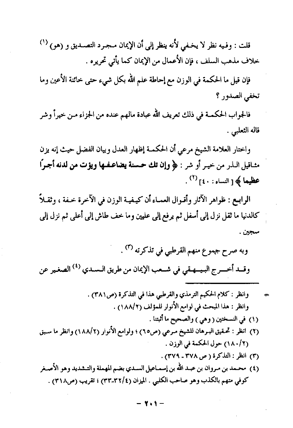 واختار العلامة الشيخ مرعي أن الحكمة إظهار العدل وبيان الفضل حيث إنه يزن مثاقيل الذر من خير أو شر: {وَإِنْ تَكُ حَسَنَةً يُضَاعِفْهَا وَيُؤْتِ مِنْ لَدُنْهُ أَجْرًا عَظِيمًا} [النساء: 40] (¬2).