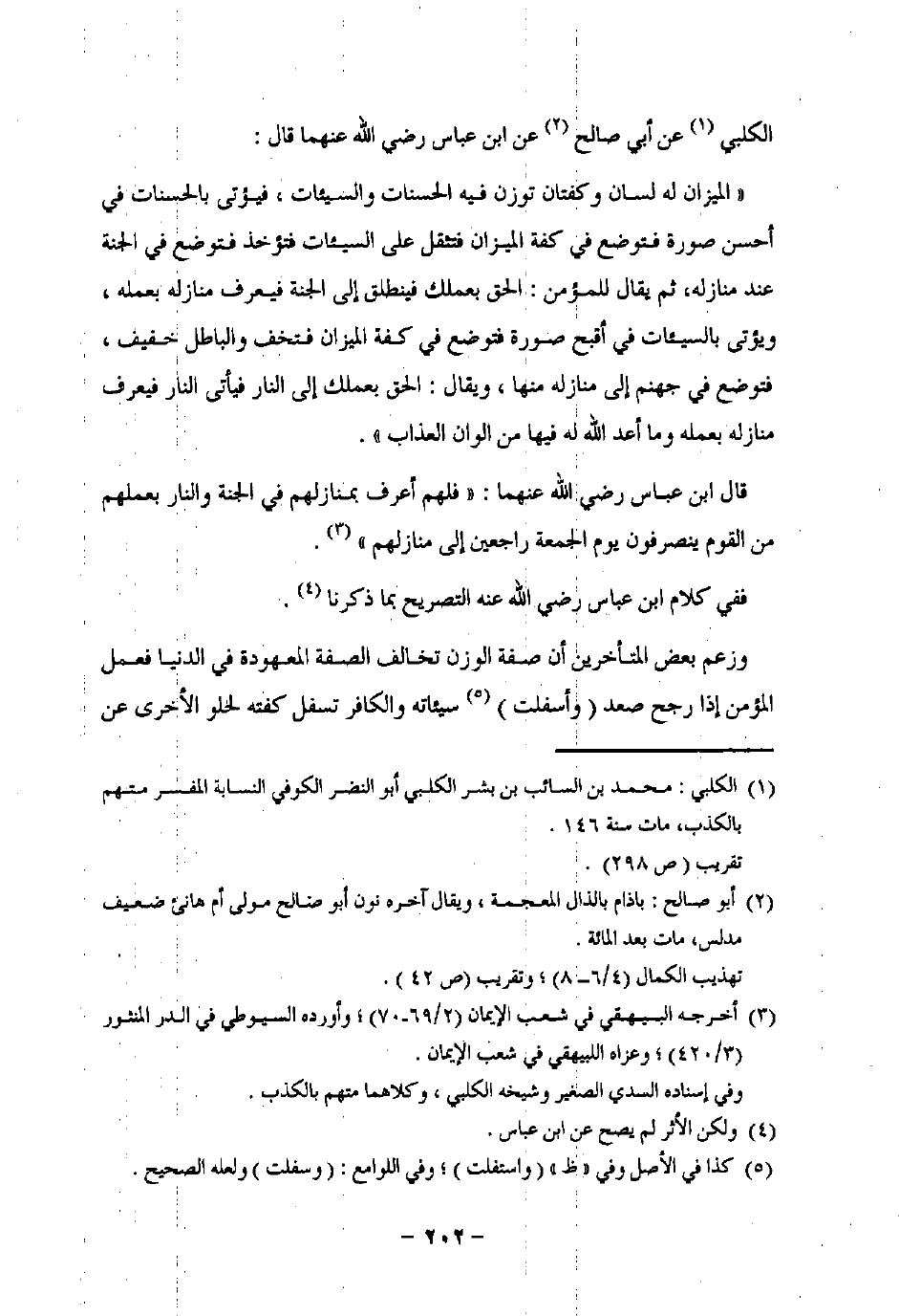 "الميزان له لسان وكفتان توزن فيه الحسنات والسيئات، فيؤتى بالحسنات في أحسن صورة فتوضع في كفة الميزان فتثقل على السيئات فتؤخذ فتوضع في الجنة عند منازله، ثم يقال للمؤمن: الحق بعملك فينطلق إلى الجنة فيعرف منازله بعمله، ويؤتى بالسيئات في أقبح صورة فتوضع في كفة الميزان فتخف والباطل خفيف، فتوضع في جهنم إلى منازله منها، ويقال: الحق بعملك إلى النار فيأتى النار فيعرف منازله بعمله وما أعد اللَّه له فيها من ألوان العذاب".
