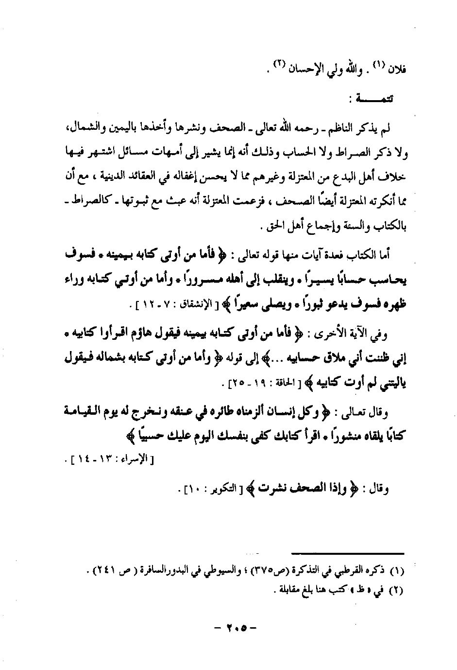 لم يذكر الناظم -رحمه اللَّه تعالى- الصحف ونشرها وأخذها باليمين والشمال، ولا ذكر الصراط ولا الحساب وذلك أنه إنما يشير إلى أمهات مسائل اشتهر فيها خلاف أهل البدع من المعتزلة وغيرهم مما لا يحسن إغفاله في العقائد الدينية، مع أن مما أنكرته المعتزلة أيضًا الصحف، فزعمت المعتزلة أنه عبث مع ثبوتها -كالصراط- بالكتاب والسنة وإجماع أهل الحق.