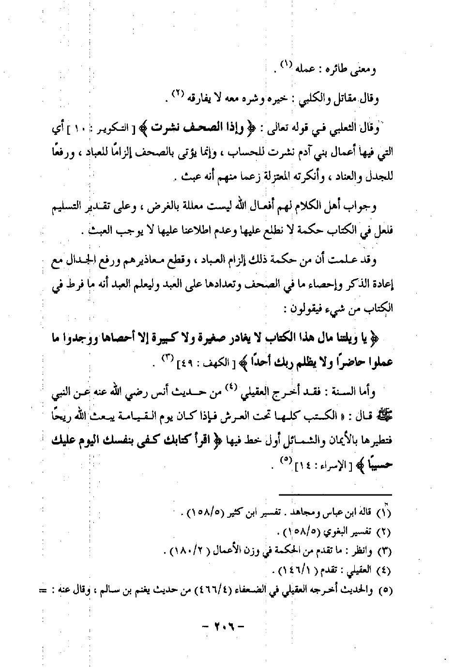 وقال الثعلبى في قوله تعالى: {وَإِذَا الصُّحُفُ نُشِرَتْ} [التكوير: 10] أي التي فيها أعمال بني آدم نشرت للحساب، وإنما يؤتى بالصحف إلزامًا للعباد، ورفعًا للجدل والعناد، وأنكرته المعتزلة زعما منهم أنه عبث.