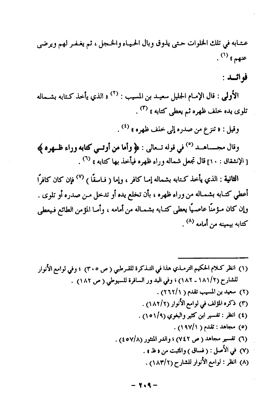 الأولى: قال الإمام الجليل سعيد بن المسيب: (¬2) "الذي يأخذ كتابه بشماله تلوي يده خلف ظهره ثم يعطى كتابه" (¬3).