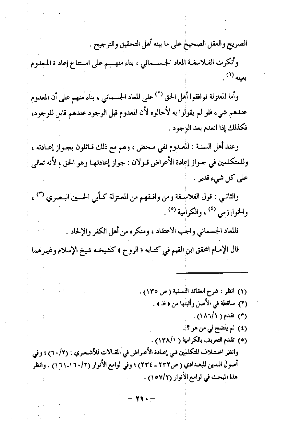 وانظر اختلاف المتكلمين في إعادة الأعراض في المقالات للأشعرى: (2/ 60)؛ وفي أصول الدين للبغدادي (ص 232 - 234)؛ وفي لوامع الأنوار (2/ 160 - 161). وانظر هذا المبحث في لوامع الأنوار (2/ 157).