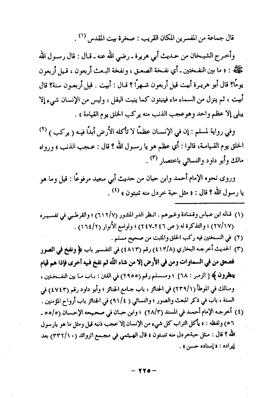 (¬3) الحديث أخرجه البخاري (8/ 413) رقم (4813) في التفسير باب {وَنُفِخَ فِي الصُّورِ فَصَعِقَ مَنْ فِي السَّمَاوَاتِ وَمَنْ فِي الْأَرْضِ إِلَّا مَنْ شَاءَ اللَّهُ ثُمَّ نُفِخَ فِيهِ أُخْرَى فَإِذَا هُمْ قِيَامٌ يَنْظُرُونَ} [الزمر: 68]؛ ومسلم رقم (2955) في الفتن: باب ما بين النفختين، ومالك في الموطأ (1/ 239) في الجنائز، باب جامع الجنائز؛ وأبو داود رقم (4743) في السنة، باب في ذكر المبحث والصور؛ والنسائي (4/ 91) في الجنائز باب أرواح المؤمنين.