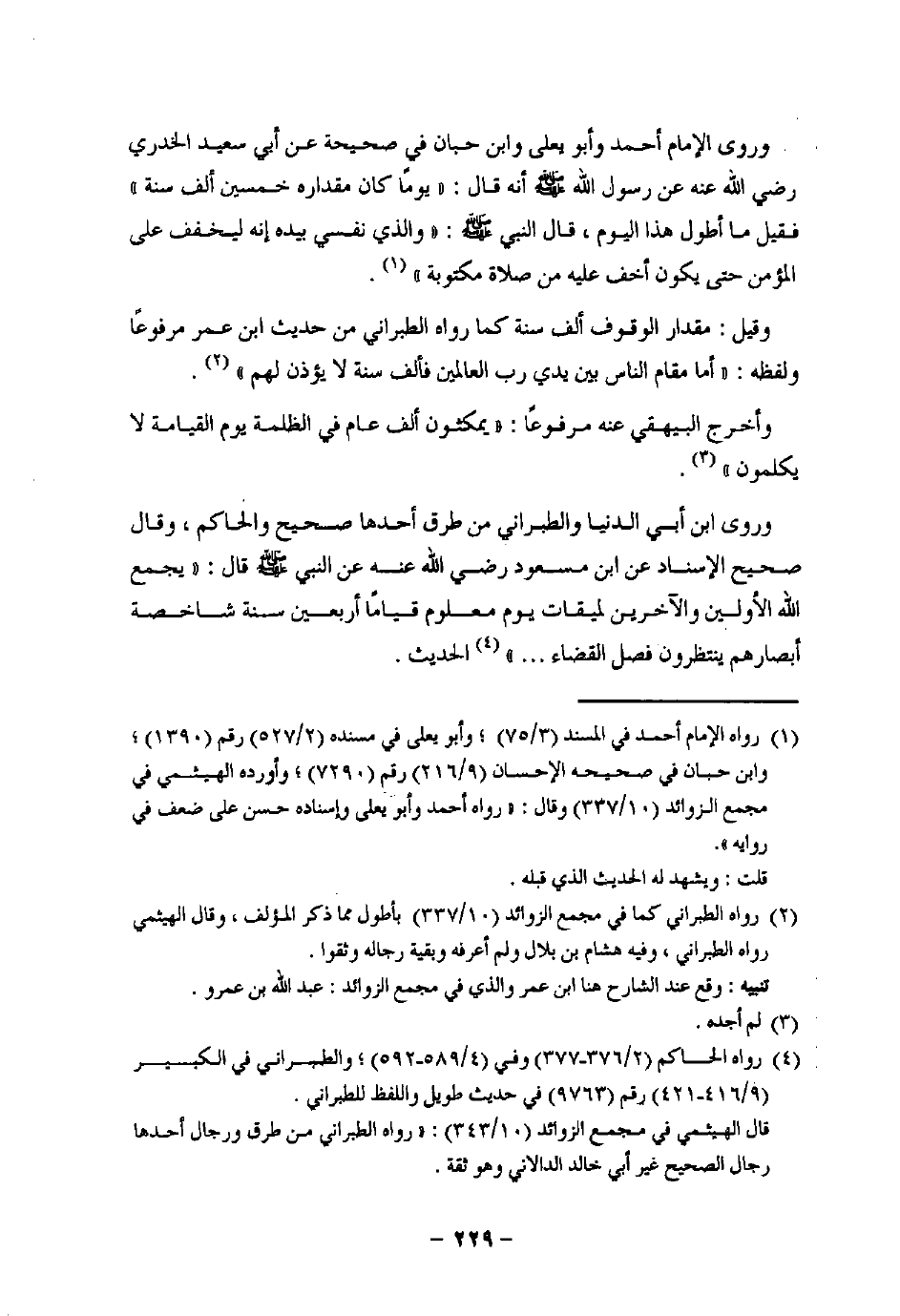 وروى الإمام أحمد وأبو يعلى وابن حبان في صحيحه عن أبي سعيد الخدري رضي اللَّه عنه عن رسول اللَّه -صلى اللَّه عليه وسلم- أنه قال: "يومًا كان مقداره خمسين ألف سنة" فقيل ما أطول هذا اليوم، قال النبي -صلى اللَّه عليه وسلم-: "والذي نفسي بيده إنه ليخفف على المؤمن حتى يكون أخف عليه من صلاة مكتوبة" (¬1).