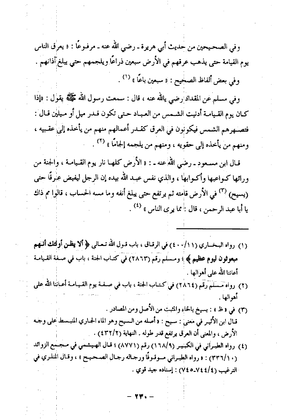 (¬1) رواه البخاري (11/ 400) في الرقاق، باب قول اللَّه تعالى {أَلَا يَظُنُّ أُولَئِكَ أَنَّهُمْ مَبْعُوثُونَ (4) لِيَوْمٍ عَظِيمٍ}؛ ومسلم رقم (2863) في كتاب الجنة، باب في صفة القيامة أعاننا اللَّه على أهوالها.