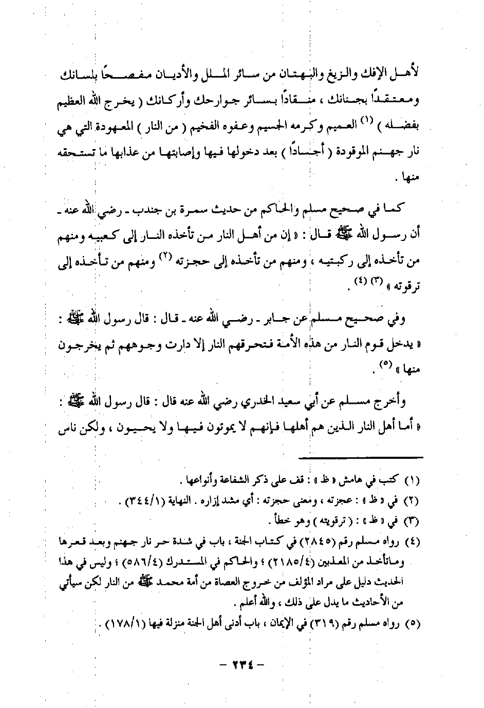 (¬4) رواه مسلم رقم (2845) في كتاب الجنة، باب في شدة حر نار جهنم وبعد قعرها وما تأخذ من المعذبين (4/ 2185)؛ والحكم في المستدرك (4/ 586)؛ وليس في هذا الحديث دليل على مراد المؤلف من خروج العصاة من أمة محمد -صلى اللَّه عليه وسلم- من النار لكن سيأتي من الأحاديث ما يدل على ذلك، واللَّه أعلم.