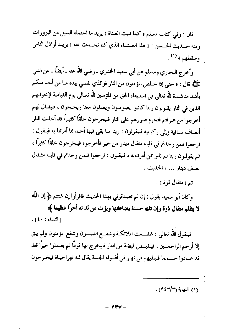 وكان أبو سعيد يقول: إن لم تصدقوني بهذا الحديث فاقرأوا إن شئتم {إِنَّ اللَّهَ لَا يَظْلِمُ مِثْقَالَ ذَرَّةٍ وَإِنْ تَكُ حَسَنَةً يُضَاعِفْهَا وَيُؤْتِ مِنْ لَدُنْهُ أَجْرًا عَظِيمًا} [النساء: 40].