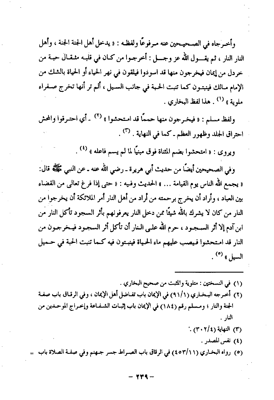وفي الصحيحين أيضًا من حديث أبي هريرة -رضي اللَّه عنه- عن النبي -صلى اللَّه عليه وسلم- قال: "يجمع اللَّه الناس يوم القيامة. . ." الحديث وفيه: "حتى إذا فرغ تعالى من القضاء بين العباد، وأراد أن يخرج برحمته من أراد من أهل النار أمر الملائكة أن يخرجوا من النار من كان لا يشرك باللَّه شيئًا ممن دخل النار يعرفونهم بأثر السجود تأكل النار من ابن آدم إلا أثر السجود، حرم اللَّه على النار أن تأكل أثر السجود فيخرجون من النار قد امتحشوا فيصب عليهم ماء الحياة فينبتون فيه كما تنبت الحبة في حميل السيل" (¬5).