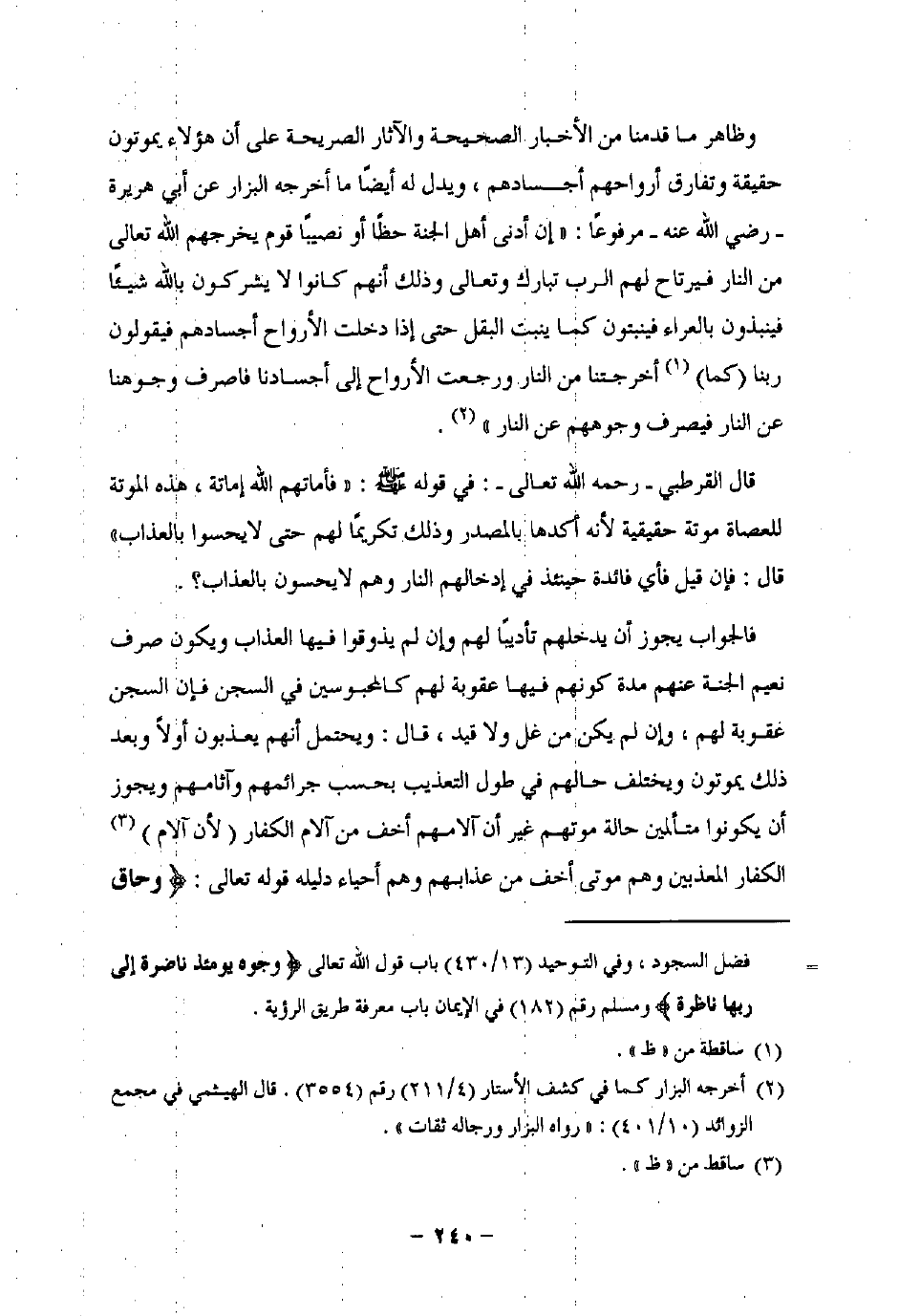 وظاهر ما قدمنا من الأخبار الصحيحة والآثار الصريحة على أن هؤلاء يموتون حقيقة وتفارق أرواحهم أجسادهم، ويدل له أيضًا ما أخرجه البزار عن أبي هريرة -رضي اللَّه عنه- مرفوعًا: "إن أدنى أهل الجنة حظًا أو نصيبًا قوم يخرجهم اللَّه تعالى من النار فيرتاح لهم الرب تبارك وتعالى وذلك أنهم كانوا لا يشركون باللَّه شيئًا فينبذون بالعراء فينبتون كما ينبت البقل حتى إذا دخلت الأرواح أجسادهم فيقولون ربنا (كما) (¬1) أخرجتنا من النار ورجعت الأرواح إلى أجسادنا فاصرف وجوهنا عن النار فيصرف وجوههم عن النار" (¬2).