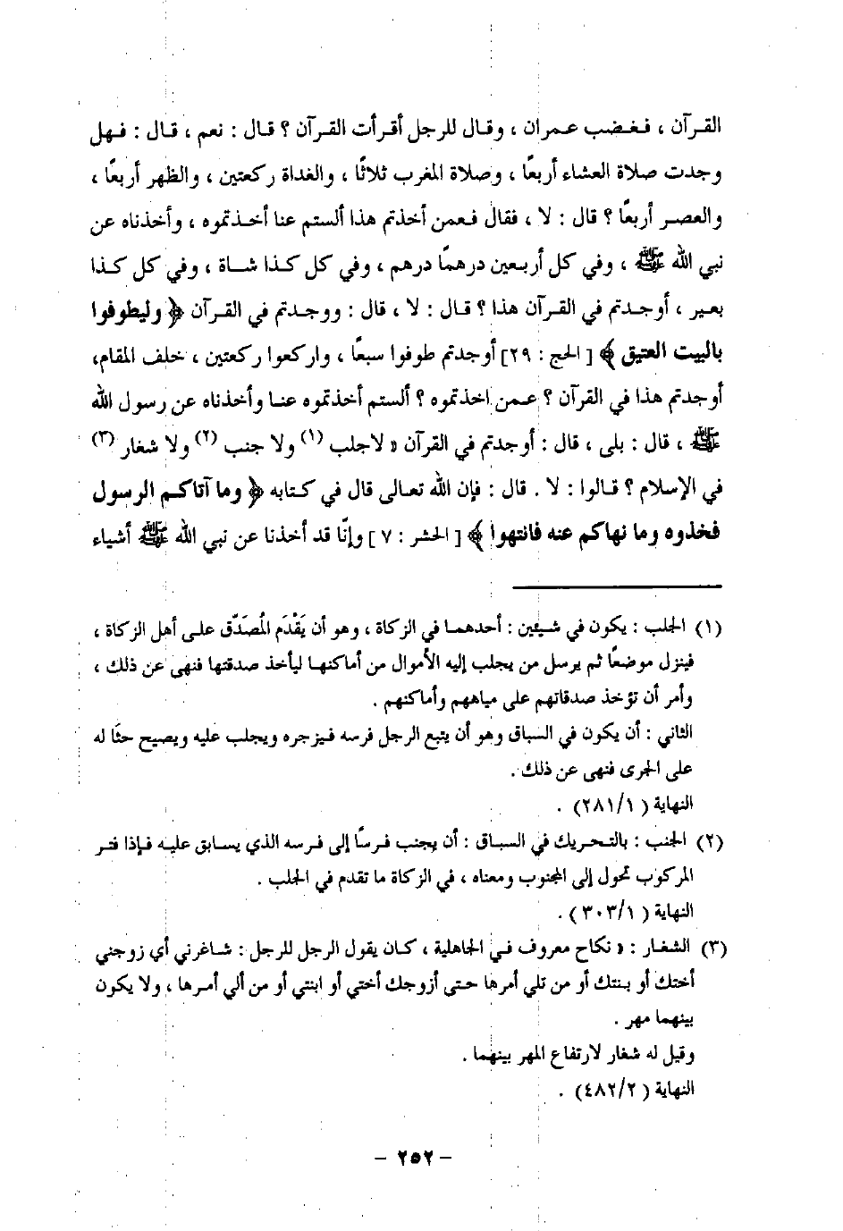القرآن، فغضب عمران، وقال للرجل أقرأت القرآن؟ قال: نعم، قال: فهل وجدت صلاة العشاء أربعًا، وصلاة المغرب ثلاثًا، والغداة ركعتين، والظهر أربعًا، والعصر أربعًا؟ قال: لا، فقال فعمن أخذتم هذا ألستم عنا أخذتموه، وأخذناه عن نبي اللَّه -صلى اللَّه عليه وسلم-، وفي كل أربعين درهمًا درهم، وفي كل كذا شاة، وفي كل كذا بعير، أوجدتم في القرآن هذا؟ قال: لا، قال: ووجدتم في القرآن {وَلْيَطَّوَّفُوا بِالْبَيْتِ الْعَتِيقِ} [الحج: 29] أوجدتم طوفوا سبعًا، واركعوا ركعتين، خلف المقام، أوجدتم هذا في القرآن؟ عمن اخذتموه؟ ألستم أخذتموه عنا وأخذناه عن رسول اللَّه -صلى اللَّه عليه وسلم-، قال: بلى، قال: أوجدتم في القرآن "لا جلب (¬1) ولا جنب (¬2) ولا شغار (¬3) في الإسلام؟ قالوا: لا. قال: فإن اللَّه تعالى قال في كتابه {وَمَا آتَاكُمُ الرَّسُولُ فَخُذُوهُ وَمَا نَهَاكُمْ عَنْهُ فَانْتَهُوا} [الحشر: 7]، وإنّا قد أخذنا عن نبي اللَّه -صلى اللَّه عليه وسلم- أشياء