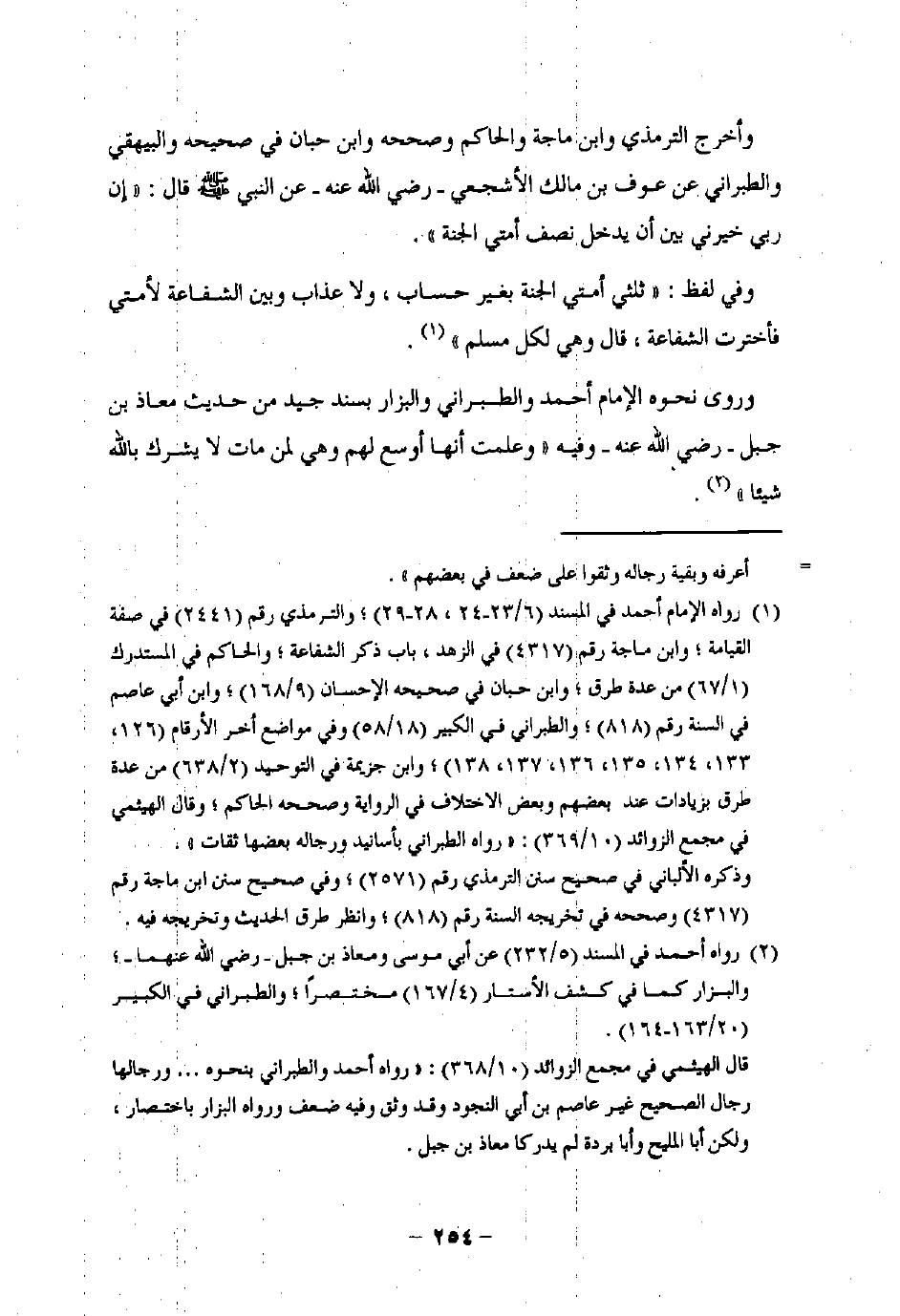 (¬1) رواه الإمام أحمد في المسند (6/ 23 - 24، 28 - 29)؛ والترمذي رقم (2441) في صفة القيامة؛ وابن ماجة رقم (4317) في الزهد، باب ذكر الشفاعة؛ والحاكم في المستدرك (1/ 67) من عدة طرق؛ وابن حبان في صحيحه الإحسان (9/ 168)؛ وابن أبي عاصم في السنة رقم (818)؛ والطبراني في الكبير (18/ 58) وفي مواضع أخر الأرقام (126، 133، 134، 135، 136، 137، 138)؛ وابن خزيمة في التوحيد (2/ 638) من عدة طرق بزيادات عند بعضهم وبعض الاختلاف في الرواية وصححه الحاكم؛ وقال الهيثمي في مجمع الزوائد (10/ 369): "رواه الطبراني بأسانيد ورجاله بعضها ثقات".
