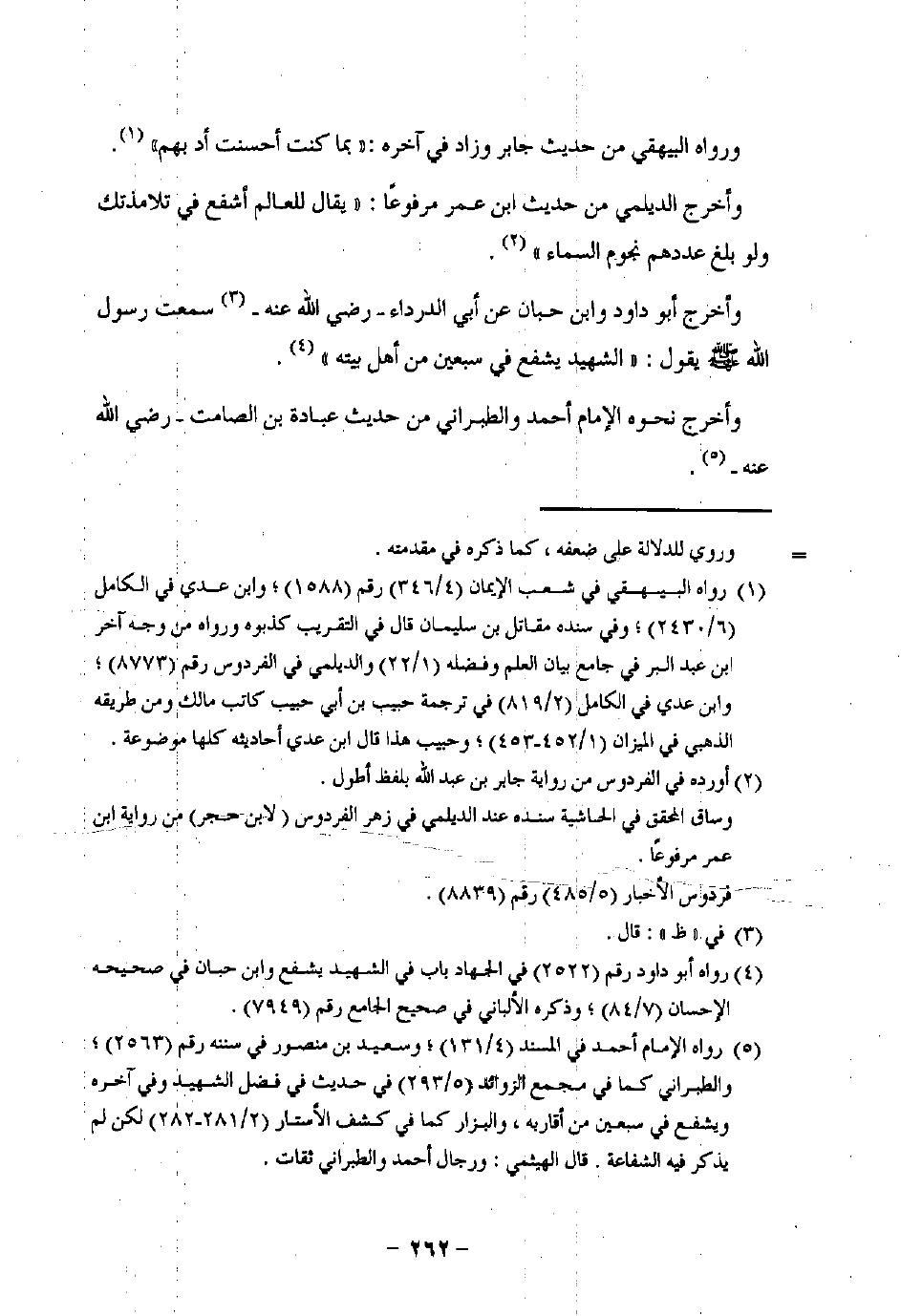 (¬5) رواه الإمام أحمد في المسند (4/ 131)؛ وسعيد بن منصور في سننه رقم (2563)؛ والطبراني كما في مجمع الزوائد (5/ 293) في حديث في فضل الشهيد وفي آخره ويشفع في سبعين من أقاربه، والبزار كما في كشف الأستار (2/ 281 - 282) لكن لم يذكر فيه الشفاعة. قال الهيثمي: ورجال أحمد والطبراني ثقات.