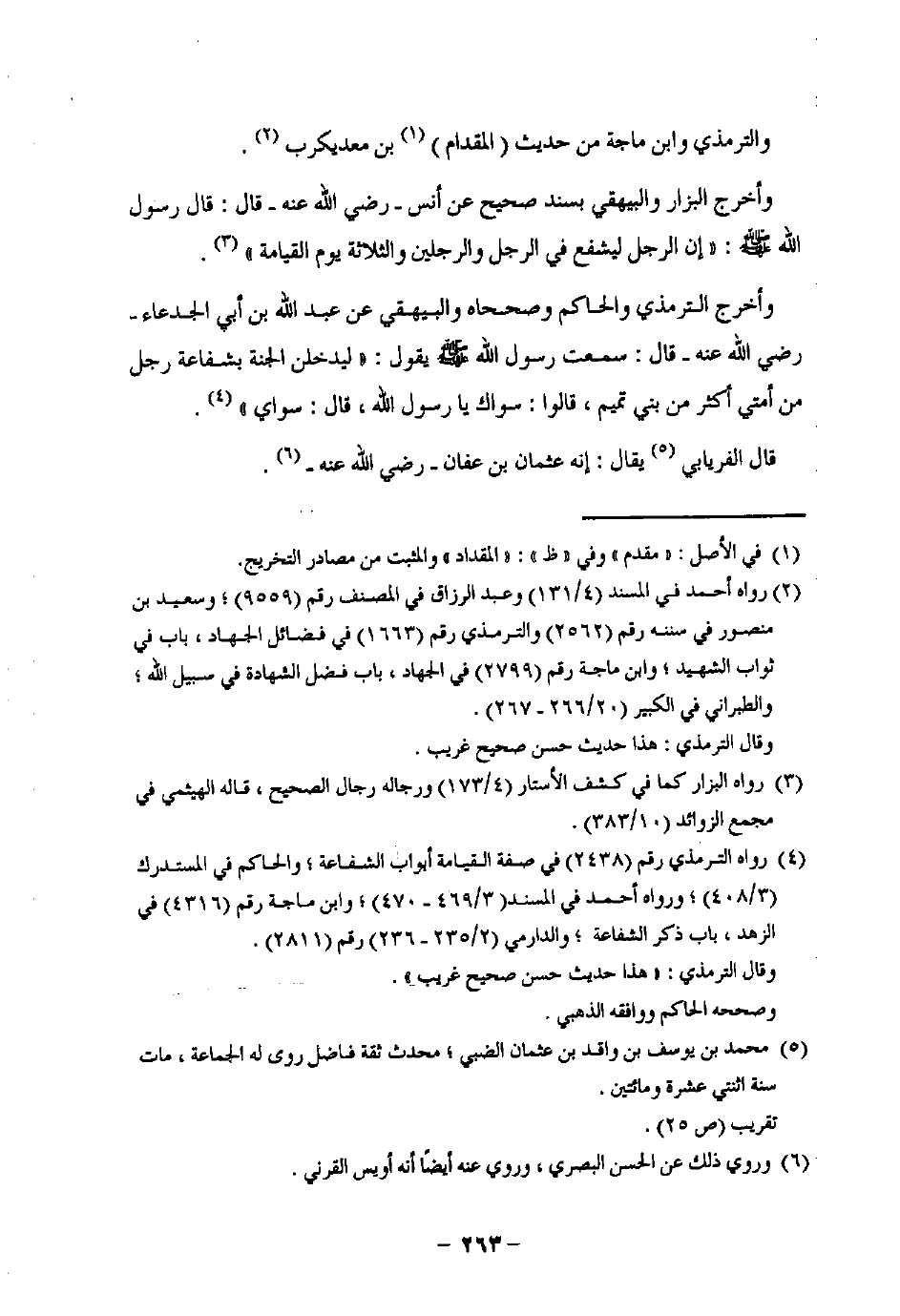 (¬2) رواه أحمد في المسند (4/ 131) وعبد الرزاق في المصنف رقم (9559)؛ وسعيد بن منصور في سننه رقم (2562) والترمذي رقم (1663) في فضائل الجهاد، باب في ثواب الشهيد؛ وابن ماجة رقم (2799) في الجهاد، باب فضل الشهادة في سبيل اللَّه، والطبراني في الكبير (20/ 266 - 267).