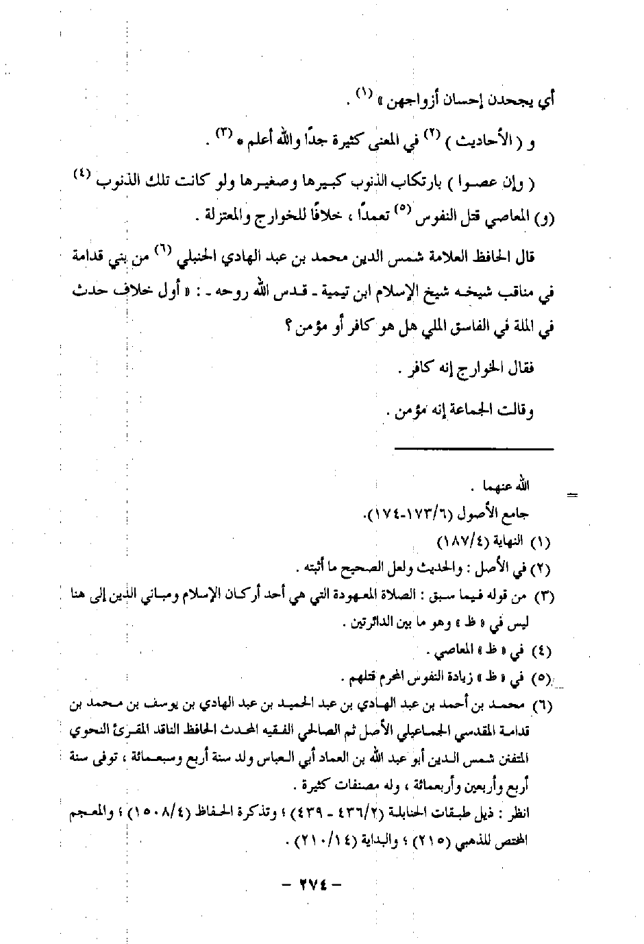 قال الحافظ العلامة شمس الدين محمد بن عبد الهادي الحنبلي (¬6) من بني قدامة في مناقب شيخه شيخ الإسلام ابن تيمية -قدس اللَّه روحه-: "أول خلاف حدث في الملة في الفاسق الملي هل هو كافر أو مؤمن؟